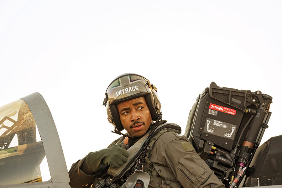 飾演Coyote的Greg Tarzan Davis對這些演練記憶猶新。「我們並沒有在演戲,而是活在其中。」他告訴我說:「我不是說我們變成了海軍飛官,但我們經歷了他們經歷過的事,學會在承受強大加速重力時眼望地平線,學會如何正確呼吸,學會避免扭頭左望右望,因為我們必須盡量面向鏡頭。阿湯總是說『我們需要看見你的臉,因為這樣才賺錢……』」