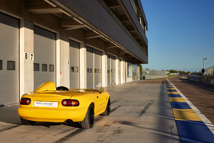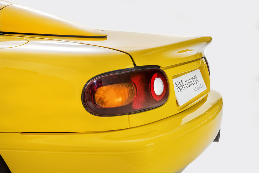 於是理所當然地擋風玻璃及車頂率先被拆除,車廂加諸了與車身同色的罩蓋,僅僅露出駕駛艙的開孔。當然在駕駛座後方亦有空力考量的駝峰設計,從頭枕正後方一路漸漸融入車尾當中。後廂蓋轉折處的小鴨尾設計頗似1992 年推出M2-1006“CobraSter”概念車的樣貌;至於引擎蓋、前葉子板以及車門則可由碳纖維製成。而在外觀方面除了保有NA的原汁原味,在每一處鍍鉻件都將之噴上啞光漆,好搭配裝上橫濱A052輪胎的深色15吋Enkei RPF1輪框與亮黃車身做出鮮明對比。在車艙內擺著一具RCC賽車椅、四點式安全帶、MOMO方向盤以及Alcantara材質做為內裝面料。為將MX-5的輕量精神發揮到極致,此車亦無空調及娛樂、音響系統等。而車輛周圍還有採取新造型的後視鏡、優化空力效應的車底及後擴散器,車門也因應Speedster風格而將面積縮減至原來的一半左右。