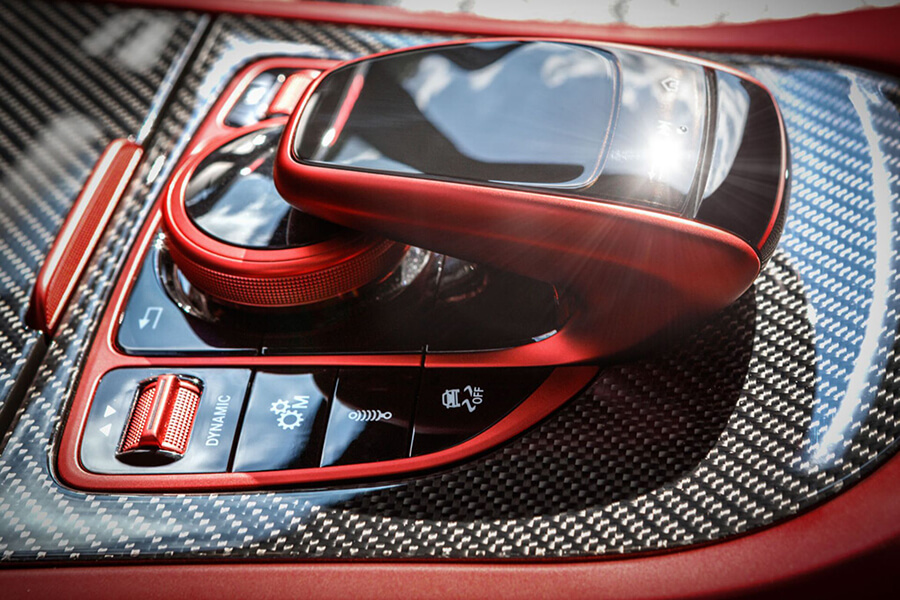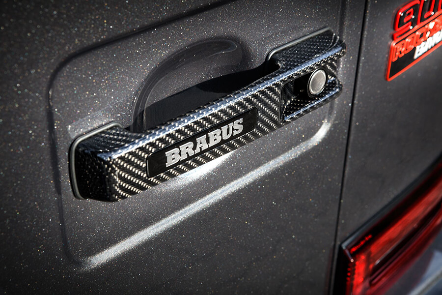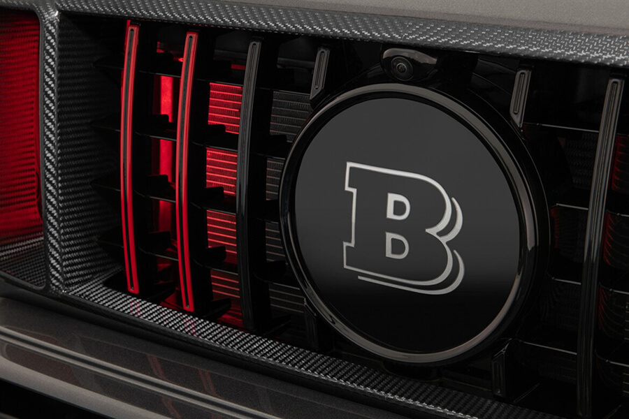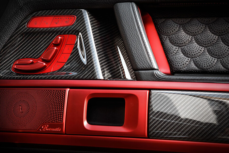 可容納四人的座艙內亦由Brabus Masterpiece經手,除了同樣採取紅黑色調搭配之外,精細皮革裁剪縫製的座椅亦具備通風/加熱功能;除此之外前座椅背後方更嵌入螢幕,使後排乘客可以透過4.3吋的觸控面板操作各項功能。同時四處可見的碳纖維表面裝飾、氣氛燈以及發光的Brabus logo。