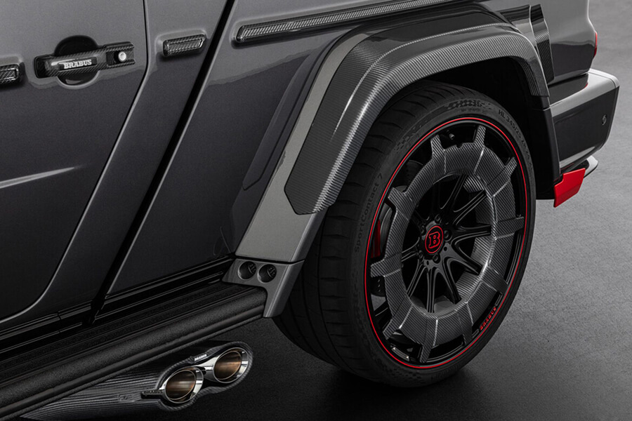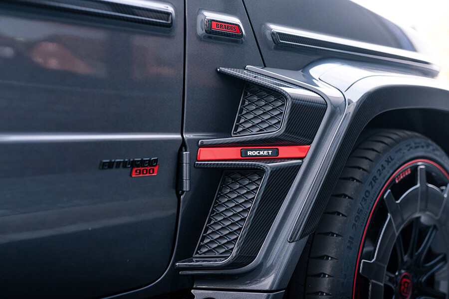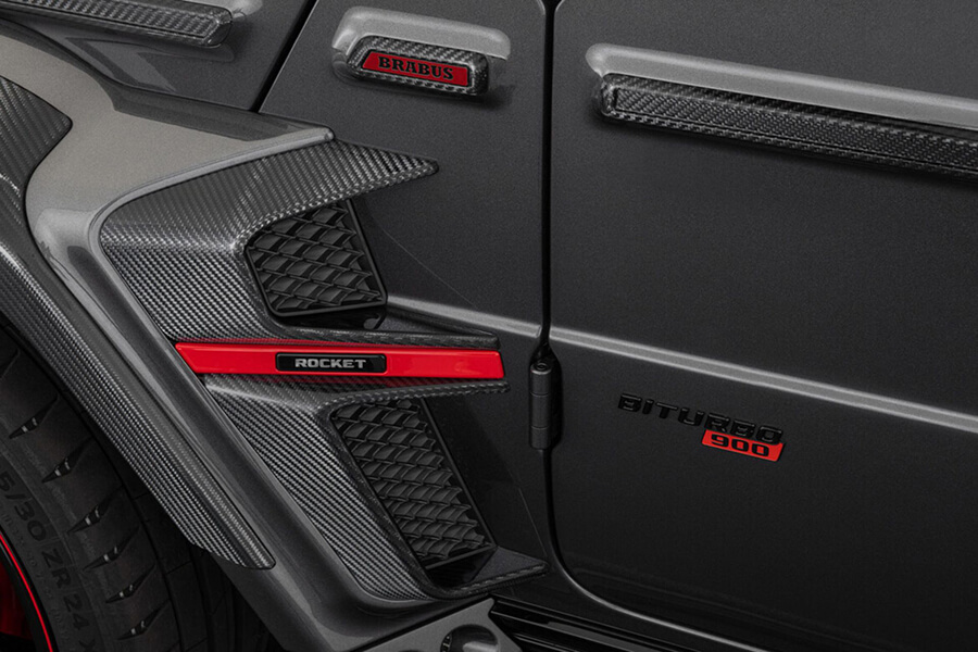 首先P 900 Rocket Edition具有帶紅色翼片的前分流器、向後延伸的擴散器;紅色拉線、燈光所裝飾的格柵亦與葉子板側鰓、紅色點綴的側出尾管相呼應。引擎蓋上除了碳纖維裝飾件,還有得以一覽引擎室風光的透明視窗設計;四處輪拱採誇張的喇叭狀外擴造型之外,後方貨床則採用鋼製底板配合碳纖維件交織而成。輪拱內的輪框則採用24吋Brabus自家的Monobloc Z白金版鍛造式樣,上頭有著環狀碳纖維空力套件點綴。輪框內部的煞車系統也相當驚人地採用400mm/370mm鋼製打孔通風碟盤