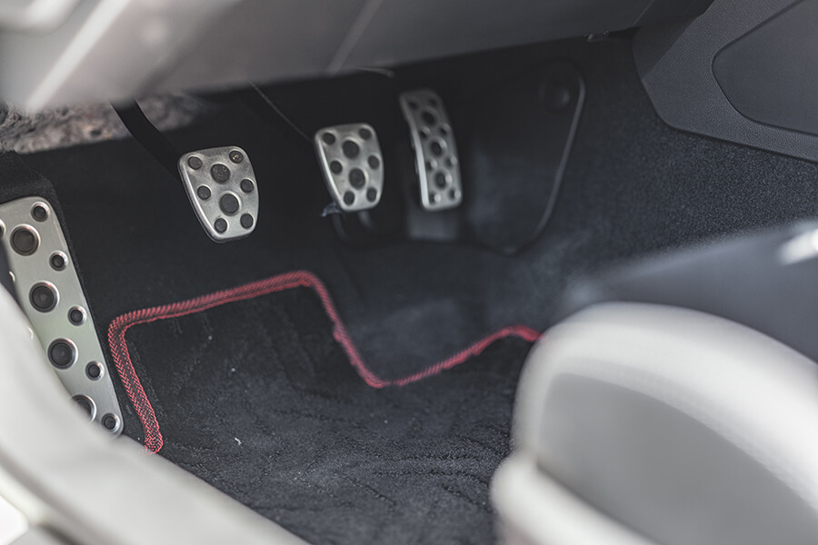 狠狠鑽進彎心並隨著重心轉移與方向盤一扯,車尾自然而然擺出一副秋風掃落葉的姿態翩翩起舞,而且更重要的是無須擔心甩過頭大吃甜甜圈,畢竟25.5kgm扭力還不到兇殘境界,只要抓到竅門,再加上一雙好鞋,包你樂不思蜀。彎路間的速度愈來愈快,這時手跟腳的換檔動作也必須加快才能跟上行進節奏,但這時卻出現突發狀況,離合器踏板居然受轉彎的側向G力而不時從鞋底滑開,這是怎麼回事?這確實增加了出彎時的半離合器操作難度,後來停車仔細查看發現三個踏板上雖有止滑的橡膠顆粒,但材質有點硬,加上我穿的鞋子底部也因為磨損及材質過硬,一下子就滑開,這也是為何我在前一段文字中提到要有一雙好鞋……。