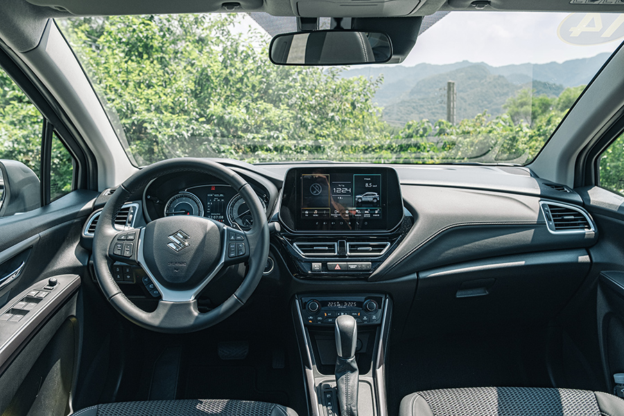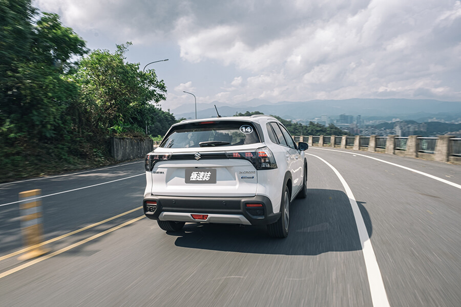 至於車內最顯眼的就是採光相當好的全景天窗了,屬於Allgrip車型標配,9吋觸控大螢幕裡頭涵蓋的功能也相當多,除了基本的Apple CarPlay及Android Auto手機連線之外,360度環景影像還有48V輕油電系統的能源流向也可以透過螢幕完全掌握。另一個吸引我的是座椅材質,以皮革搭配編織材料,之所以感到特別是這個編織材質的止滑效果相當好且不會悶熱,相當好。至於安全配備,Suzuki Safety Support的內容相當豐富,可以預期的ACC、BSM盲點偵測、車道偏移警示及DSBS碰撞預警煞車輔助都在陣中,幾乎找不到可以挑剔之處,標線中規中矩。