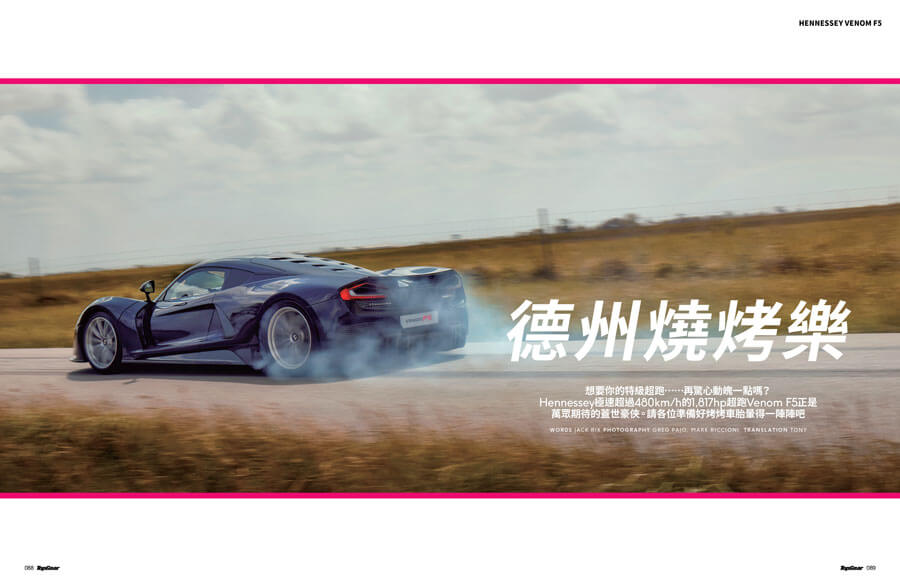 儘管冷氣已經開盡全力,你我在德州烈日下還是汗流浹背熱似一塊烤牛排。在我的正前方,是一條冒出模糊熱浪的四分一哩筆直柏油路,背後有一副V8發出暴龍咬著整包B&H吞雲吐霧一樣的怠轉聲,整部車在懸掛彈簧上前後搖曳,我則皺起眉頭盯著面前那個酷似mannetino的撥掣。開發Venom F5的全體人員正站在遠處一邊耐心等候,一邊懷疑我是睡著了還是心臟病發。