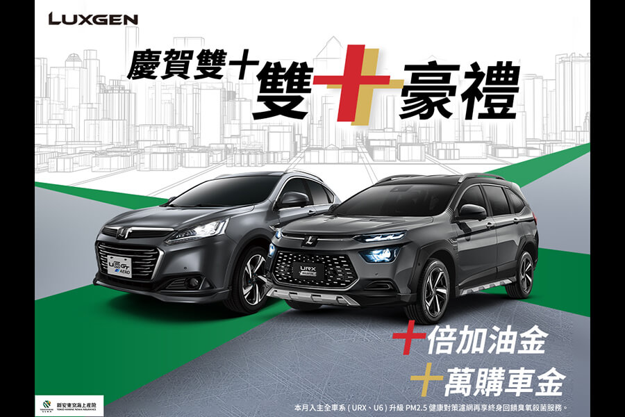 為迎接跨年前最後一個連續假期的來臨,10月LUXGEN特別推出「慶賀雙十」專案:預約試乘抽10倍加油金,以及全車系購車優惠最高10萬元購車金。