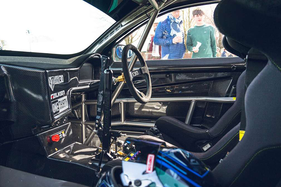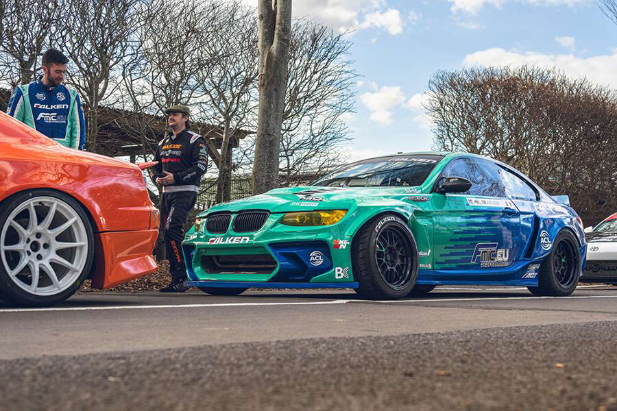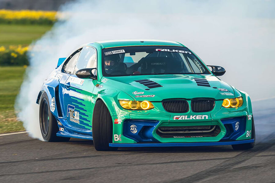 咦,我剛剛說這台車是部M3嗎?事實上我也懷疑如此描述算不算恰當:除了安裝了豐田的怪獸及引擎外,此”E92車身”表面其實皆以carbon-Kevlar材質製成,大幅降低了車重。除此之外,訂製的懸吊系統具有更大的轉向角,這對一部甩尾賽車來說至關重要;同時後輪框內除了後煞車卡鉗外,更多了一副卡鉗以專門應付手煞車的做動。