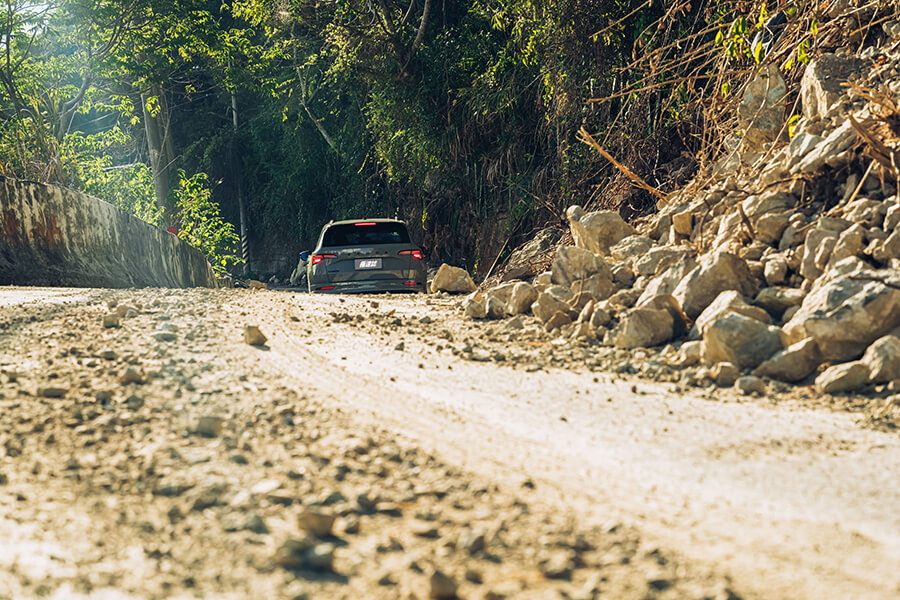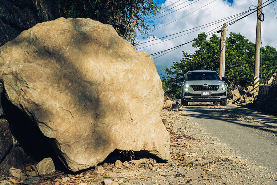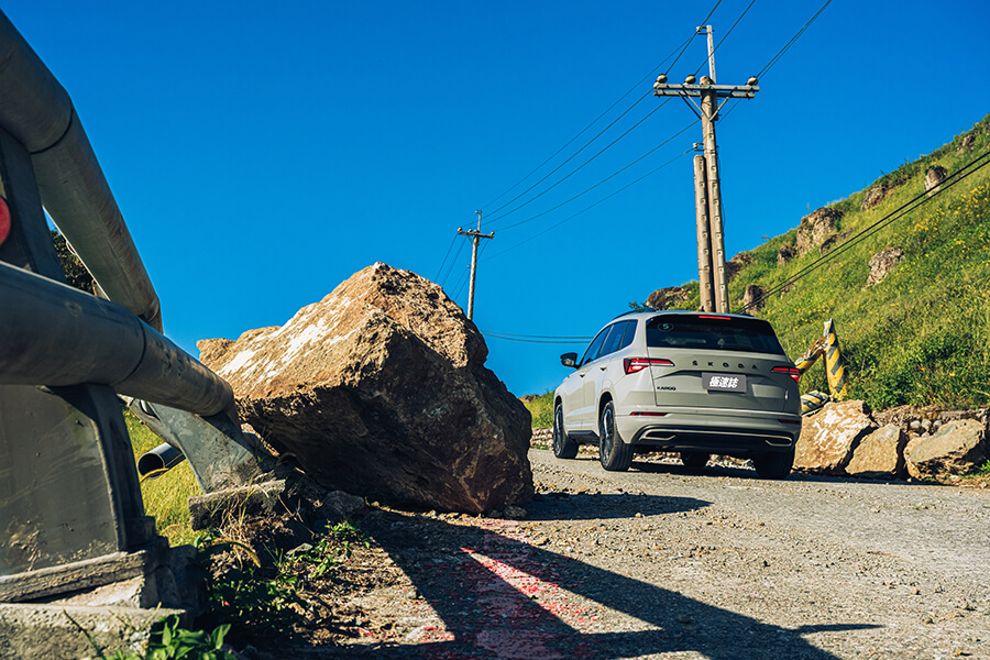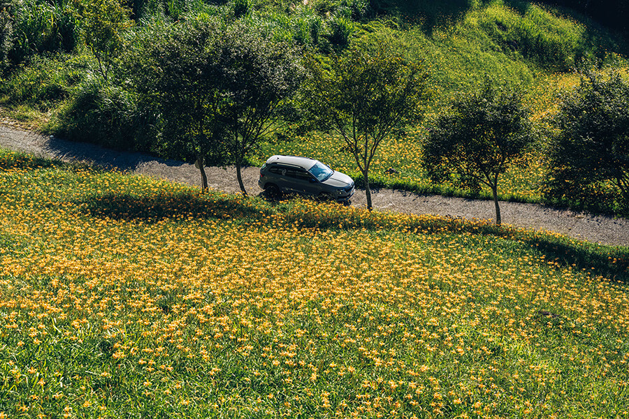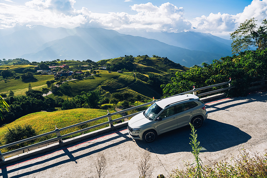登上海岸山脈的路徑從蜿蜒到陡峭,路旁不時出現一些細碎落石,隨後變得愈來愈大。在穿越地面裂縫、沙土路面以及卵石道路等多重路況過後,在斜射的夕陽下終於坐擁六十石山的展望、並置身開闊的金針花海。在一片夕陽無限好當中,憑藉著Karoq低轉豐沛的扭力與Area View環景系統的搭配下使前進狹小、起伏的地帶進行取景、乃至隨後的全身而退皆顯得易如反掌。