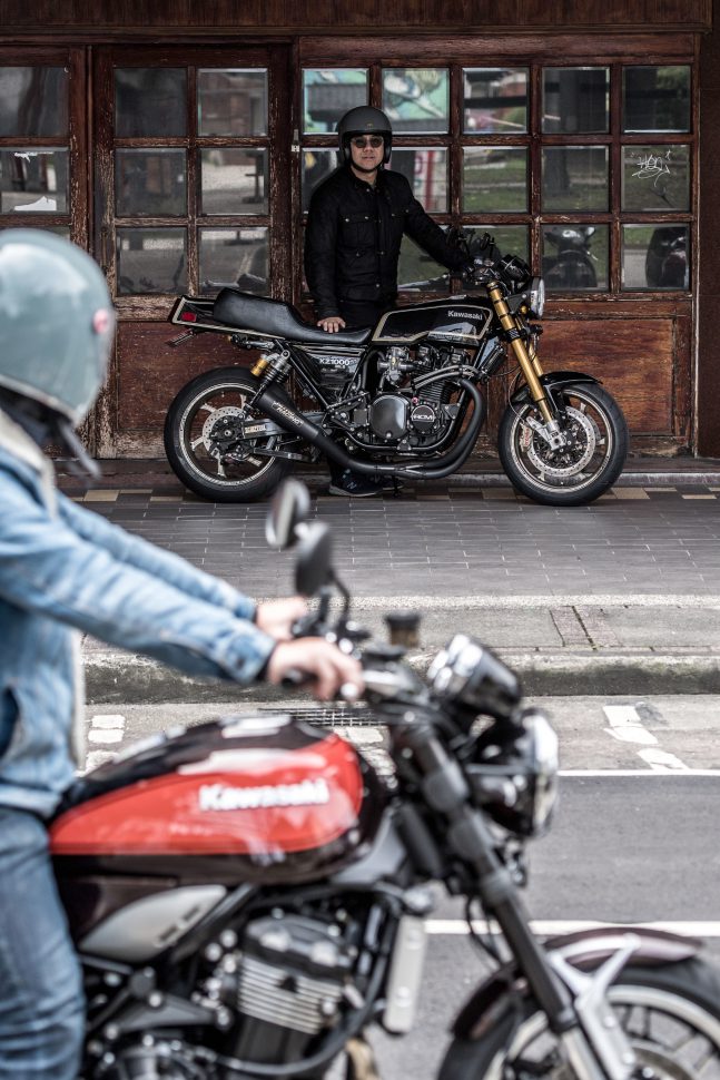 經小編與陳姓狂人確認無誤後,終於拍板敲定與這輛KZ1000 MK II及新生代z900 RS約會時光,果然人還是需要有點信念的,離赴會時刻越近外頭風雨卻越大,經小編我實驗認證之後,早晚三柱香還是有個準頭,一早穿帥帥準時赴約這對令人心花怒放的東瀛拜金女,果然不負眾望,才見新時代Z900 RS推出就以令人銷魂,橘紅黑的復古元素彩繪加上極為親民的車身體態,更不用說留一台是一台的經典戰神KZ1000了,經過Sanctuary RCM雕琢過的KZ1000 MK II,可非改裝部品湊滿湊好交差,講究極致甚至龜毛的老師傅們,為了迎接即將強化過的引擎效能,可說是將整輛車細部分解一般,在保留原有風味之外,還針對了車台作了相當幅度的結構增強,前三角台及後搖臂則用上Sculpture專門為Sanctuary RCM量身訂做的客製品,特別的是,一般老車都會用上前正插的設定,此次為求懸吊效能心切的狂人指定用上倒插避震器,眼睛雪亮的朋友一定還有注意到,除了用上Brembo卡鉗及直推已屬基本功,但跨下那兩粒17寸專屬KZ1000打造的O.Z鍛造框可就稀世珍寶了。