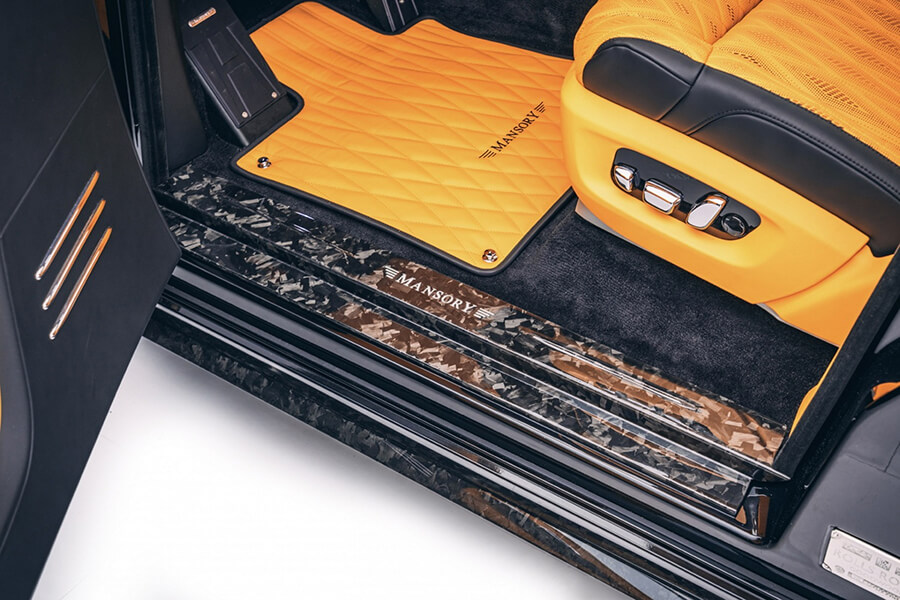 開啟對開式車門之後,絨皮包覆的內飾同樣運用大量亮橘色表面,方向盤、中央通道、車頂棚、地墊、門板無一例外。與亮橘色形成對比的還有些許的輛黑鋼琴烤漆點綴,還有當然地:鍛造碳纖維表面材質與Mansory字樣一同在門檻上迎接賓客。