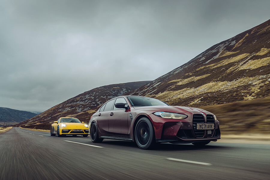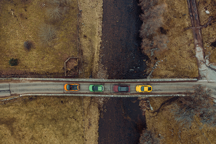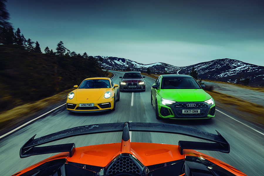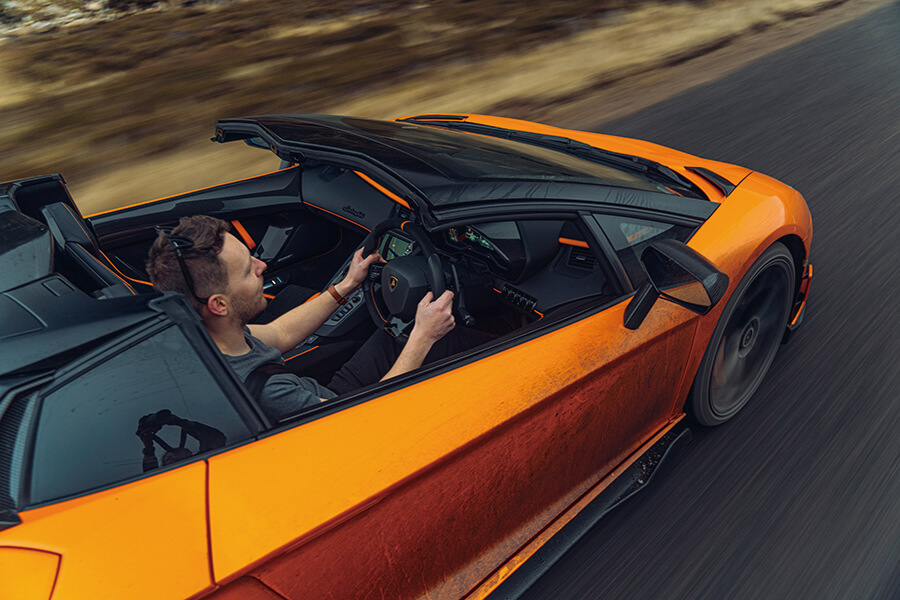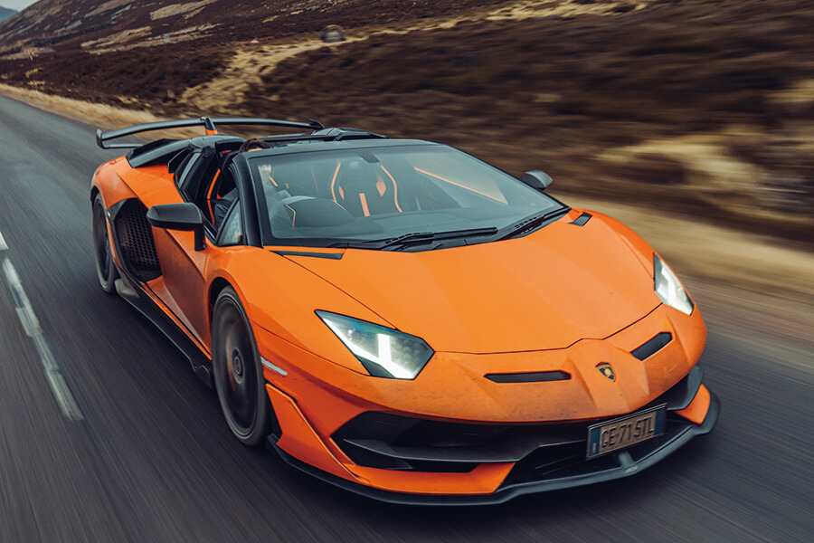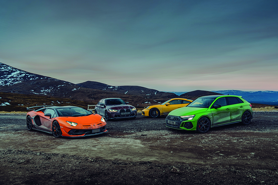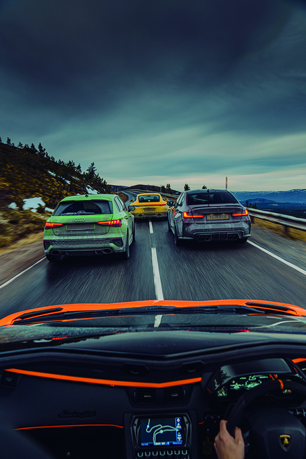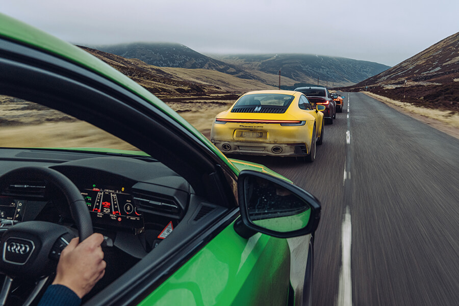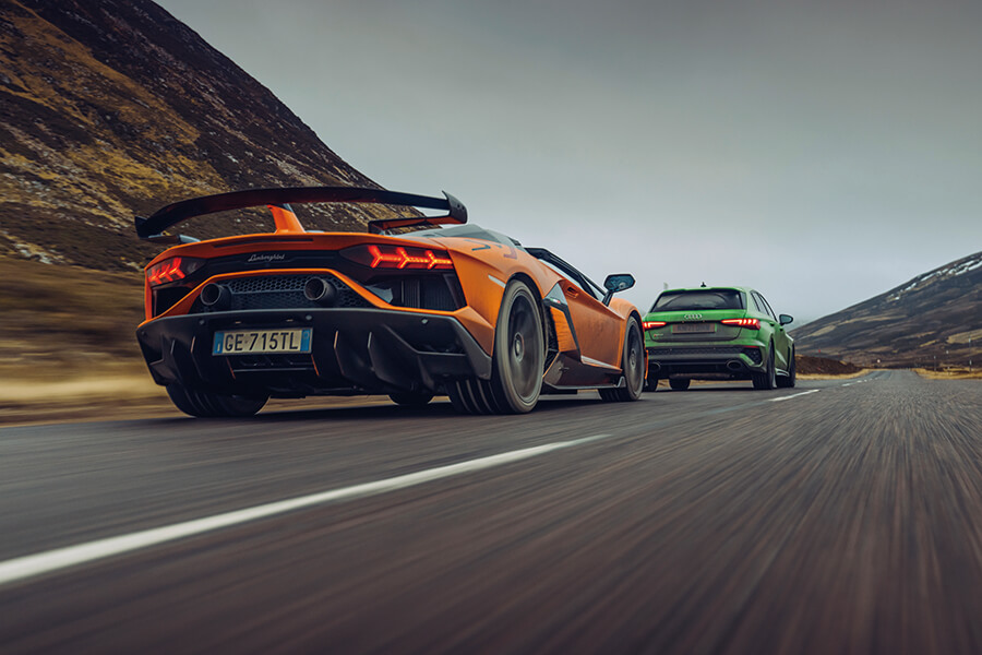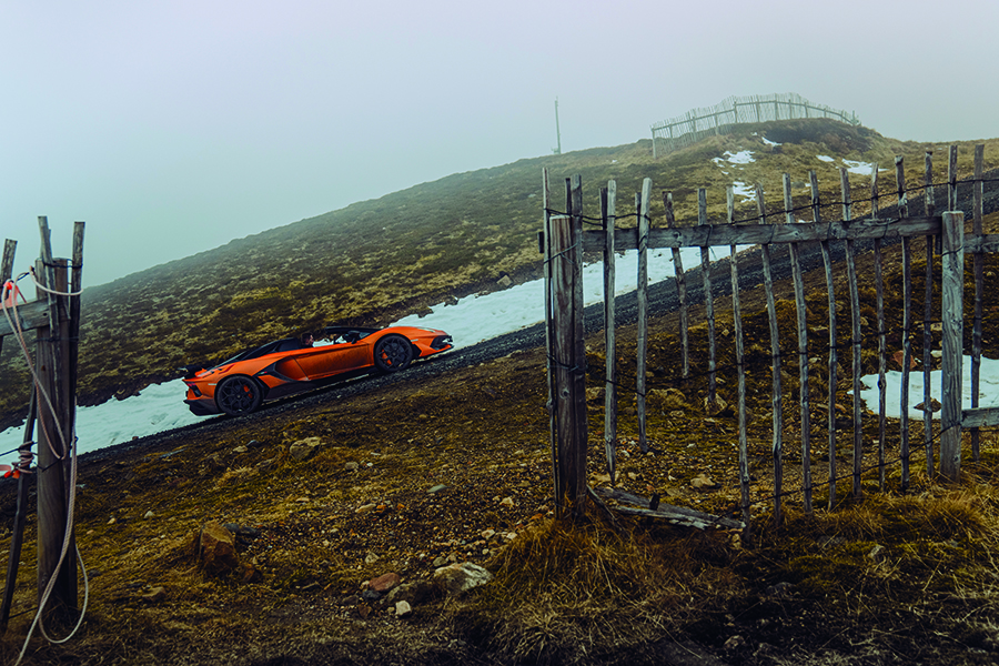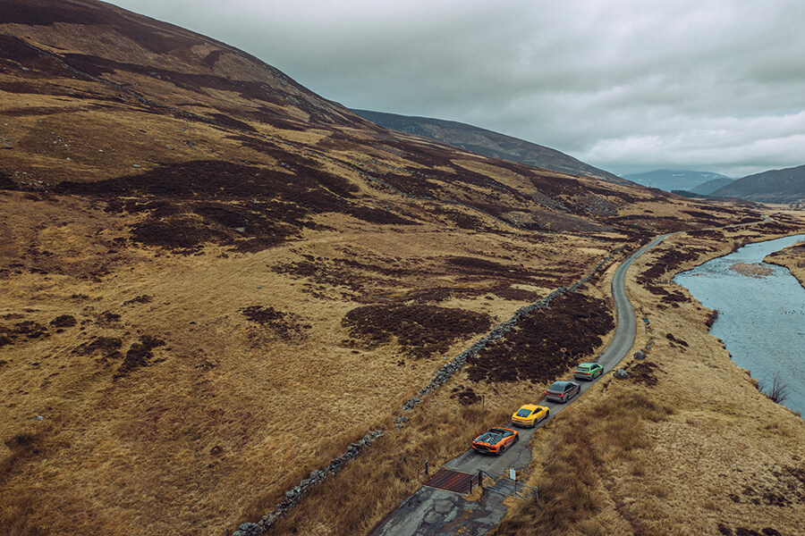 我們在布萊里亞赫(Braeriach)附近再次調換駕駛席。布萊里亞赫是英國第三大高山,山上有一個與氣候轉變息息相關的觀光名勝——在某處岩坡的山溝中,你會找到一片因為藏身之所不見陽光而終年不融的冰雪塊。就算在炎炎夏日,這片人稱「斯芬克斯」的冰雪通常都不會融化。事實上根據已知記錄,斯芬克斯在過去三百年間只曾八次完全融化掉,其中六次發生於剛剛過去的四分一個世紀,2021就是其中一年。沒錯,我很欣賞用這支顏色好比棒棒糖、馬力加起來有2,129hp的車隊在斯芬克斯腳下浩浩蕩蕩一掠而過的那份諷刺感覺。Aventador SVJ吐出的二氧化碳比911和RS3加起來還要多,所以這是林寶堅尼最後一代的非混能V12作品,我當然會準備好迎接這個變化。
