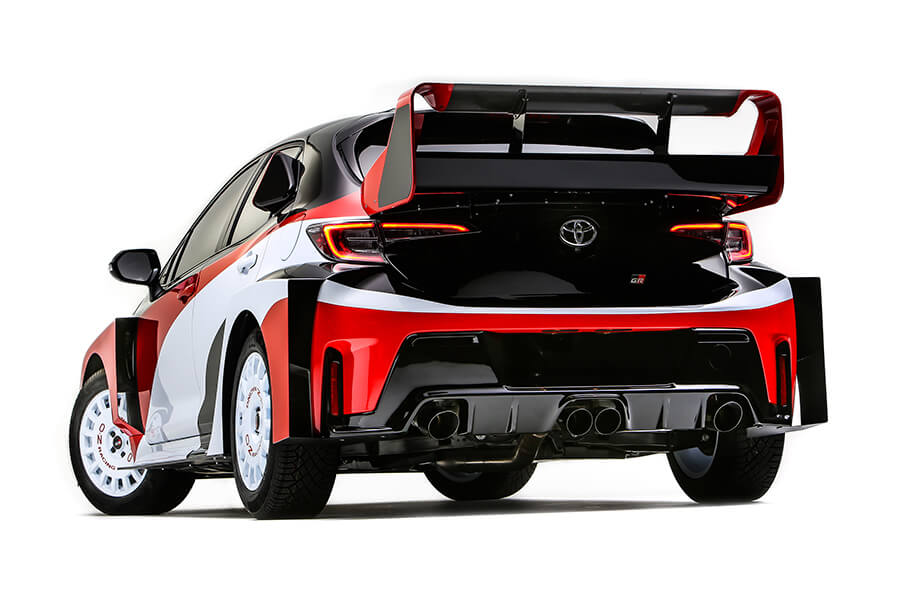 不難在第一眼便認出專為拉力賽情境而生的GR COROLLA RALLY CONCEPT在外觀具備誇張的葉子板、碳纖維複合材料製成的側裙、分流器以及大型尾翼,後門三角窗上突出的通風口造型則由3D列印而成。17×8吋OZ Racing的輪框搭配215/60R17的ontinental Viking Contact冬季胎,所連接的懸吊配有權可調的TEIN Gravel Rally避震器,煞車系統則採用14×1.1吋通風開槽碟盤,匹配鋁製四活塞卡鉗。車輛內部有OMP Racing出品的賽車座椅、安全帶以及滅火系統。