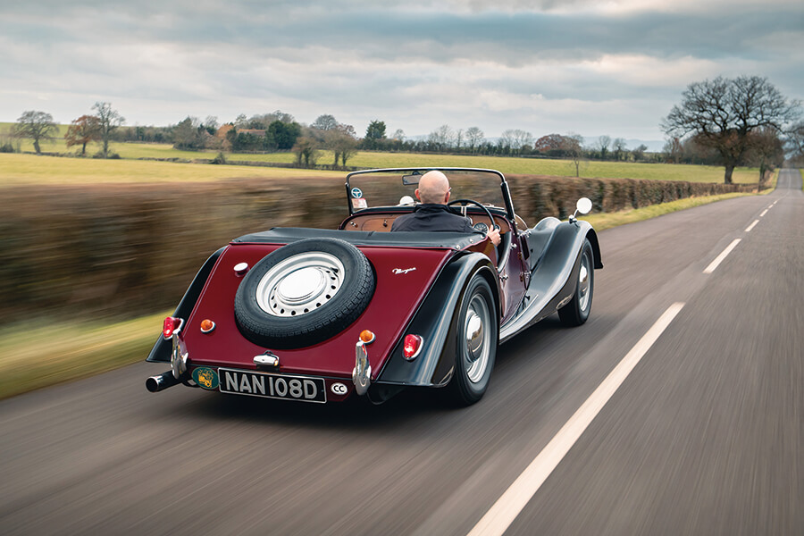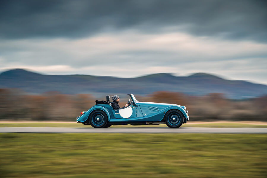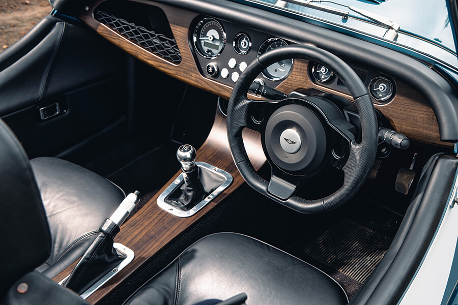 紅黑雙色合乎出廠年份的那一部是六零年代Morgan 4/4,1.6公升四汽缸福特引擎的75hp和13.6kgm經由四速手排送往後輪。這具變速箱使用常見的H形閘槽,但排檔桿是從錶板底下伸出來的,操縱方法需要花些許時間熟悉。藍色那一部是全新的Plus Four,2.0公升寶馬渦輪增壓四汽缸的255hp和35.7kgm經由六速手排輸往後輪。