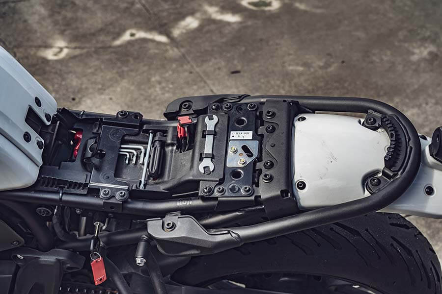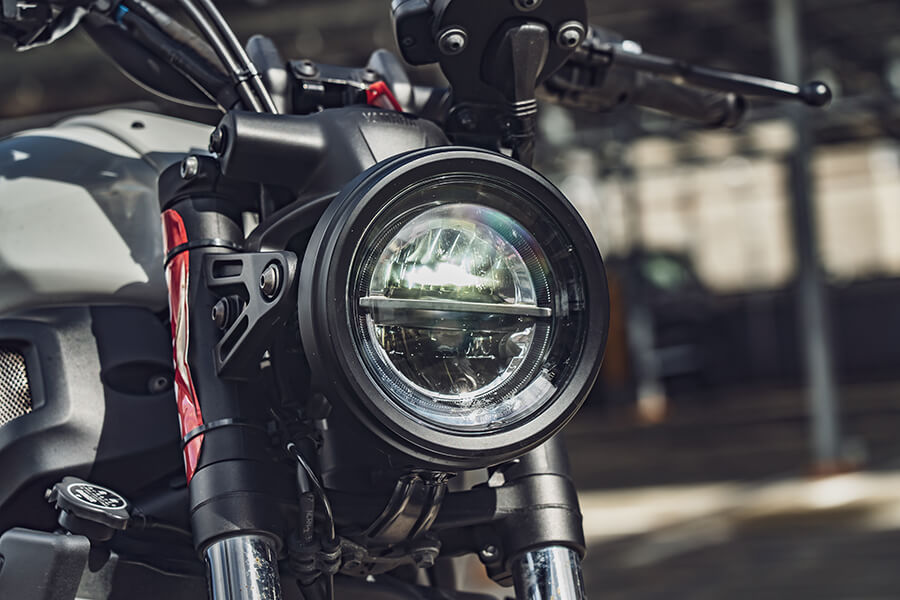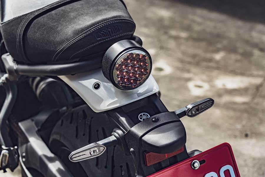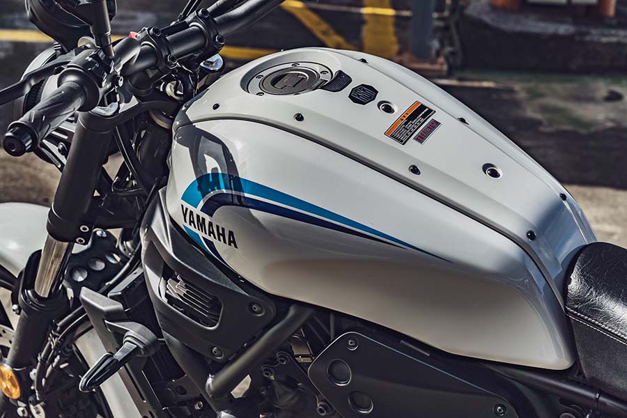 要受到各地機車改裝玩家的青睞,絕對不僅止於”看起來帥”而已,更重要的是整體的可玩性。山葉推出這款復古街車顯然直衝著此一族群而來,不僅將副車架設計為可拆式,更透過Yamaha Yard Built計畫與全球各地玩家合作、開發車身改裝套件,儼然將此車視為發揚想像力的大平台。但即便是心向此道、卻擔心五年後屢屢受到台灣驗車人員荒謬的刁難,亦可把本就設計得短潔俐落的車尾以及油箱保持原樣:筆者在此特別所指是那顆長長的油箱。白色的表面、雋永的YAMAHA字標與兩道深淺交疊的藍色勾線靈感可是取自1980年代RZ車系的經典配色,即便只有油箱罩及前後土除有漆面覆蓋,清爽脫俗的氣息卻不斷透出,不禁讓人想與它在Daytona海灘上展開一場”Racing on the Beach”。