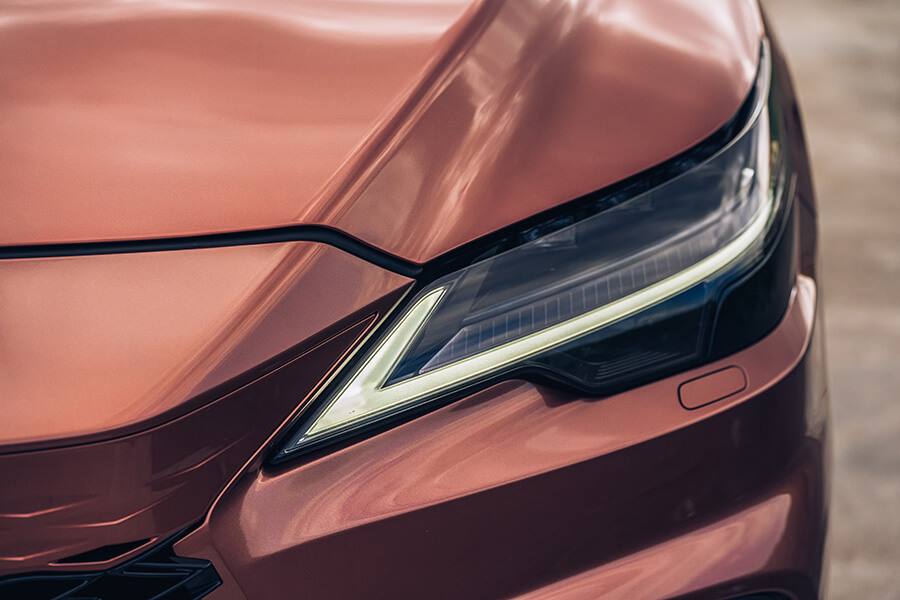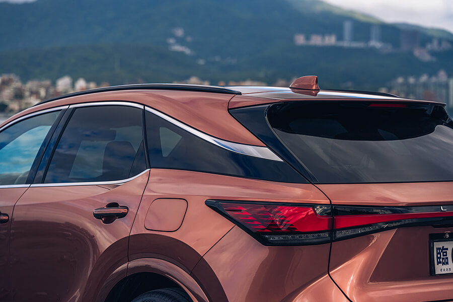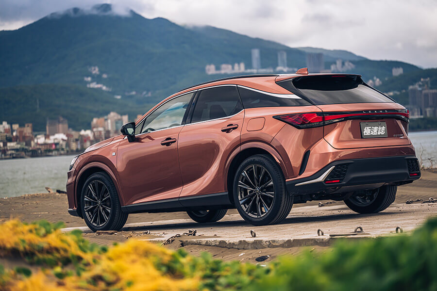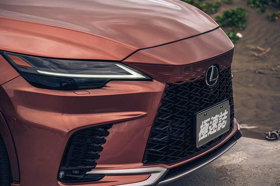 RX新車的青春動感不再只是來自於某些刻意的外觀設計,而是一種整車散發出的格調與韻味,你可以很明顯的發現它Crossover化,沒有那麼SUV了。放低的車高,略短一點的軸距還有加寬的車身,調整A柱拉長車頭比例與短促的車尾,配上相對寬扁一點的車身和縮減的離地距,讓實車的比例架構倒是有幾分旅行車的意思,寬扁的車身也帶來一種類暴龜的視覺效果,特別是車尾形成不少性能車特有的上窄下寬”凸”字型架構,跟以前好像廣體客艙飛機的小車頭大身體有很大的不同處。再加上日系品牌最近都很流行的鈑件明暗光影,我甚至覺得理論上客層更年輕的NX,造型反倒顯得中庸保守。當然啦,我們手上的RX350 F Sport,有著21吋胎圈與別具特色的烤肉網進氣壩,配上這個紅銅風味的新色,想不被注意都難啊。