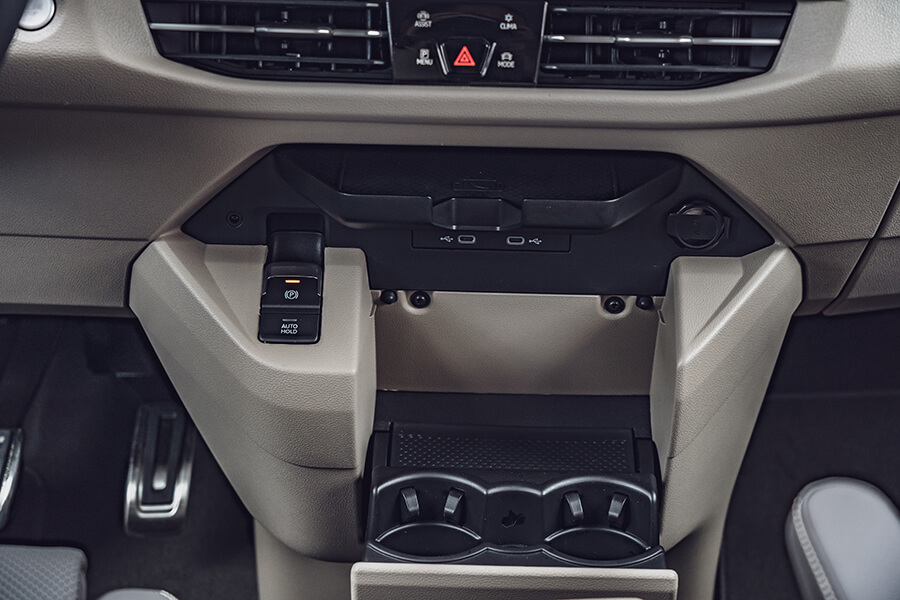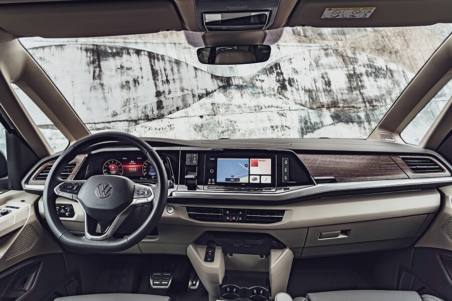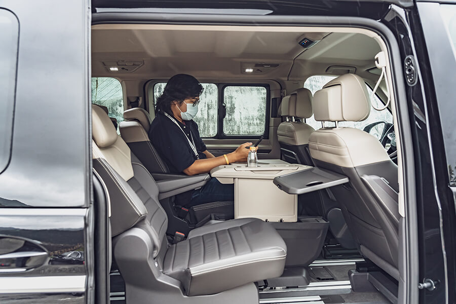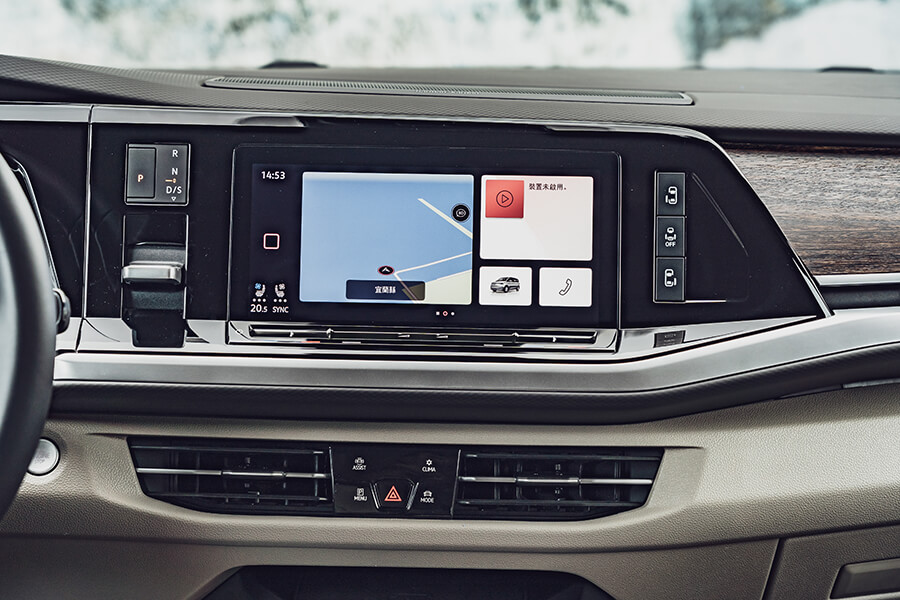 前座部分,駕駛介面算是融合了Golf與舊款Multivan。還是有點高的座位跟登車步驟很是熟悉,這時就覺得沒有A柱扶手有點麻煩,但還是可以利用雙A柱三角窗的凹槽權充一下扶手。坐定位之後發現方向盤位置變得垂直不少,更正對駕駛人,駕駛姿勢很貼近一般MPV,並沒有不久前才試過的T6.1公車司機感,兩個10吋有餘的數位儀表與多媒體主機提供非常熟悉與好用的科技氛圍,同時套用新的線傳撥桿式排檔與整合到數位面板上的車門開關介面,讓控台變得簡潔工整,下方則是依循傳統,附上活動式杯架空間與無線充電板,加上副駕前方的上下雙手套箱,雖然還是很機能感,但身處其中的操作親切度與或是氣氛,都很有私家乘用車的感覺。另外很好玩的是新版多功能桌,現在可以從前座一路滑動到第三排前方,增加不少使用機會,而且從圓桌改為T型左右對稱方形桌板,加上前座後方也備有摺疊桌板,看得出來是對於家庭用戶的禮遇所進行的改變。