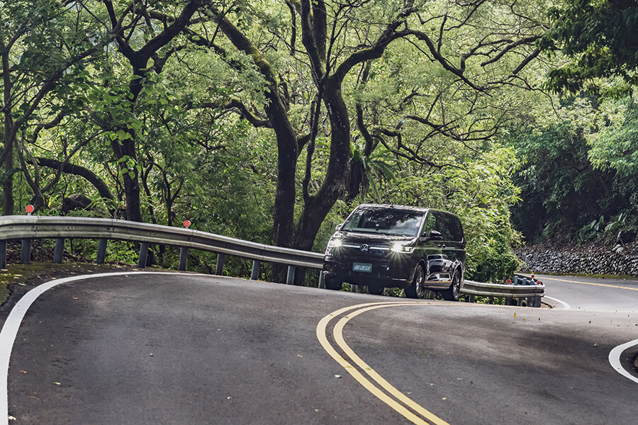 走進北宜山路後,除了座姿免不了有點高的小問題外。以前開著Multivan就不想進山路的想法已經被一掃而空,DCC主動懸吊的支撐表現讓Multivan不再搖頭晃腦,穩定高車身的慣性搖晃也很有一套,山路上我好像是在開一台四倍大的超大號Golf一樣,車體穩定輕盈、轉向準確好掌握,底盤總是可以服貼於路面,切上運動模式與手排還可以來一段拉轉殺個彎的華麗演出;雖然我知道滿載狀態絕不適合這樣開,但可以在山路上發揮不讓人費盡心思的動態表現,我其實不太想相信這是Multivan能辦到的事。