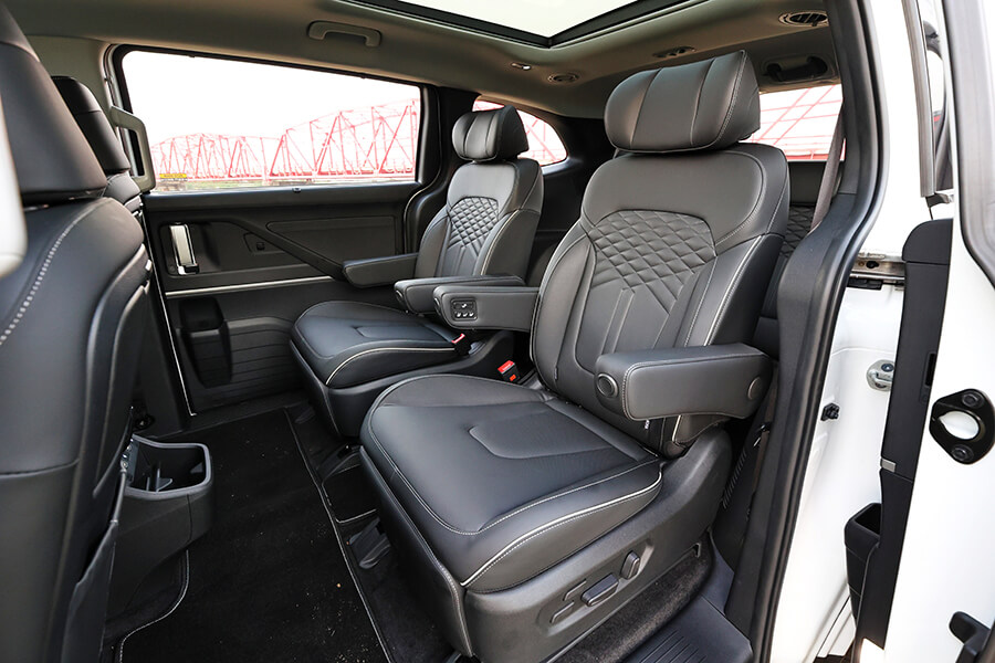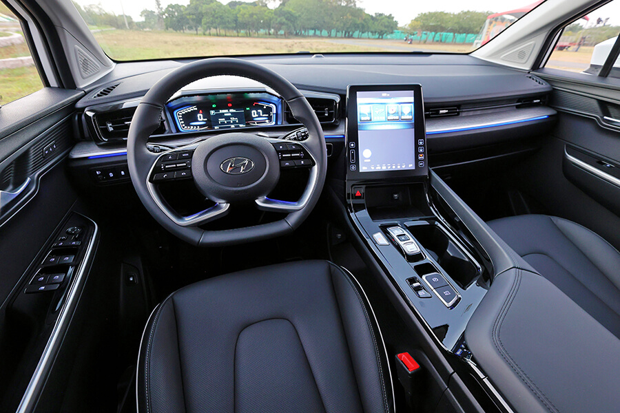 而論車艙鋪陳與配備這方面,Custin有完整汲取到MPV車款至今悠久歷史的經驗談,第二排座椅編排很合乎所有人對於它的期待。像是獨立雙後座在我們試駕的VIP是全電動可調,更有媲美旗艦房車的一鍵躺平功能,這也包含傾倒時座椅會向中間靠攏的過程也是全電動,副駕也會連動向前收折創造大空間,這項功能就一點商務使用服務的味道了。Custin的配備數量基本上走的是吃到飽路線,目前品牌內一線安全輔助系統都全數搭載,不論是上下車的偵測協助還是Level 2駕駛輔助都沒有遺漏;控台上10.4吋的直立螢幕如果避開台製導航畫面,其他的整個顯示介面與圖樣文字配置,雖然跟目前韓國主線產品不太一致,但在原廠的盡力協助下,倒不會給人一種自創介面的簡陋感,而且座椅通風加熱還是協助第二排進行傾倒都可由此介面裡一併處理,豐富功能讓我好好的花了點時間才一一記下,後來才發現這車其實只有單區恆溫,加上試駕車也尚未加上隔熱紙,在最近還是穿短袖為主的中南部移動,也確實感受到冷氣強度似乎有點不足。