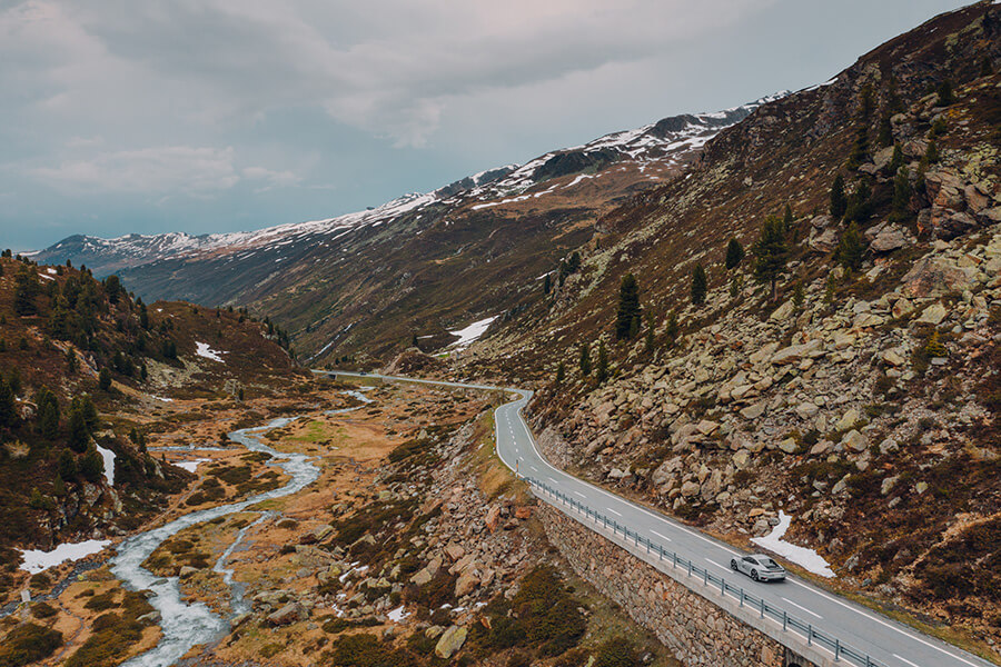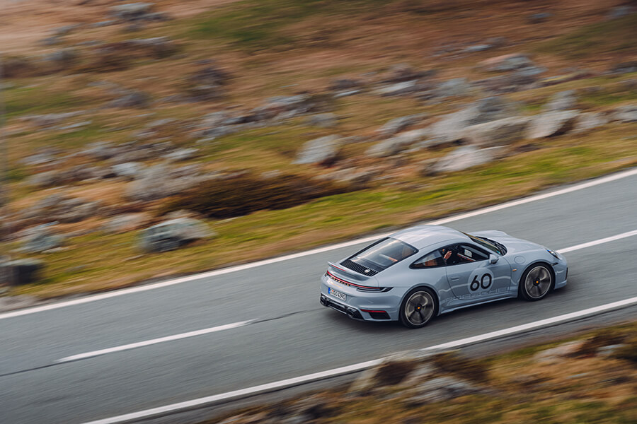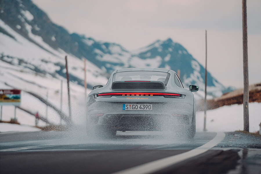 不知是否白雪蓋頂的脆弱自然美使然,當我們來到Flüela隘口時,一切一切彷彿一下子豁然開朗。992 Sport Classic在這裡簡直如魚得水,電子輔助轉向和師法911 Turbo、911 GTS的吸震功夫合璧之下,在曲直變化順暢的高速山路竟能熨平大部分顛簸路面,同時又能夠不受四驅影響提供十分清脆的訊息反饋。無論你鼓起多大勇氣落力鞭策,車架都好像游刃有餘,令你忍不住用自己也覺得有欠妥當甚或不太可能的速度風馳電掣;好一部懂得蒙騙人的邪惡快車。不過跟911 R一樣,Sport Classic並不是執於性能數值的汽車。老實說,性能數值在這裏只能屈居於駕駛感受之後,一種經常帶有某種有趣色彩的感受。我所指的有趣色彩,就是增壓暴力。