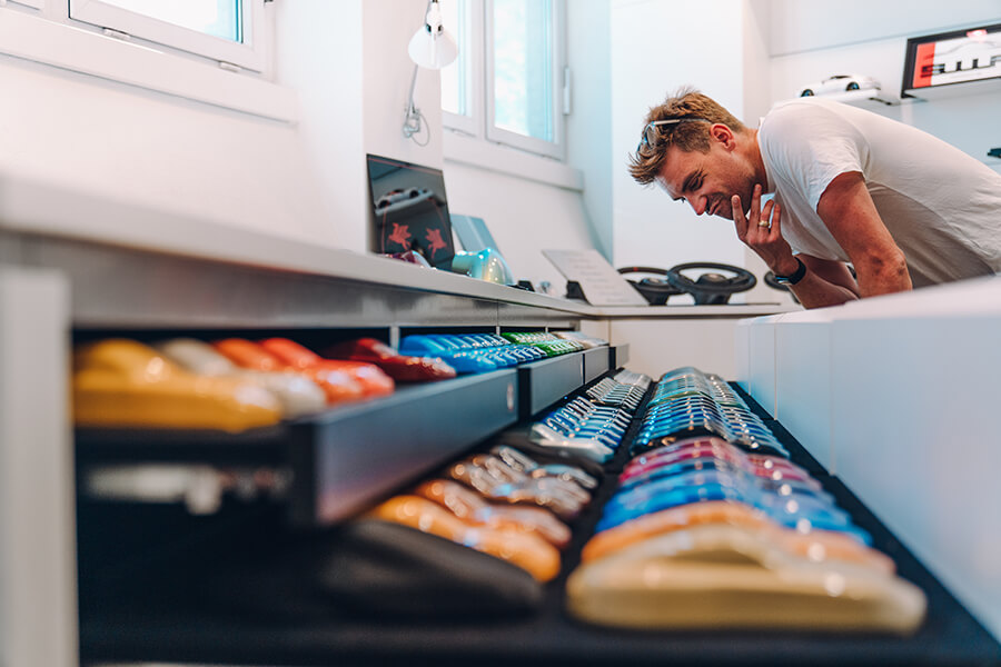 你在這邊會找到一排排抽屜,抽屜內放有一排排造成保時捷跑車形狀的色板,色彩之繽紛足以跟LSD發燒友最發燒的發燒夢境爭輝。如果覺得這樣還不夠,保時捷的Paint to Sample Plus可以幫你把座駕的顏色套用到愛犬指甲鉗上。對隨身財物有偏好的話,大可以花10萬鎊用人手方式把紙幣常用的防偽變色顏料塗滿整個車身,事實上保時捷最近便接受過這樣的委託。