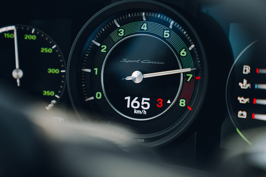 擺脫單調乏味的都市交通後,我們很快便看到那個神聖徽號——以白色底色上四條黑色斜角線表示無限速公路在前的路標,正好讓新版Sport Classic發揮發揮它的速度。不過與動力增加了23hp(達到408hp)的同行997 Sport Classic剛好相反,992的動力原來不升反降,3.7公升引擎的最大馬力已從572hp削減至542hp,扭力也從76.2kgm降至60.9kgm,以確保手排變速箱不會被過猛的低轉扭力絞成爛鐵。話雖如此,997仍然免不了留在992的後視鏡上吃塵。每當我升高一檔,白色類比指針都會飛快掠過光亮轉速錶上的綠色螢光數目字(如同老爺356),車速數字轉瞬之間竟已突破270km/h,真是快到沒朋友。