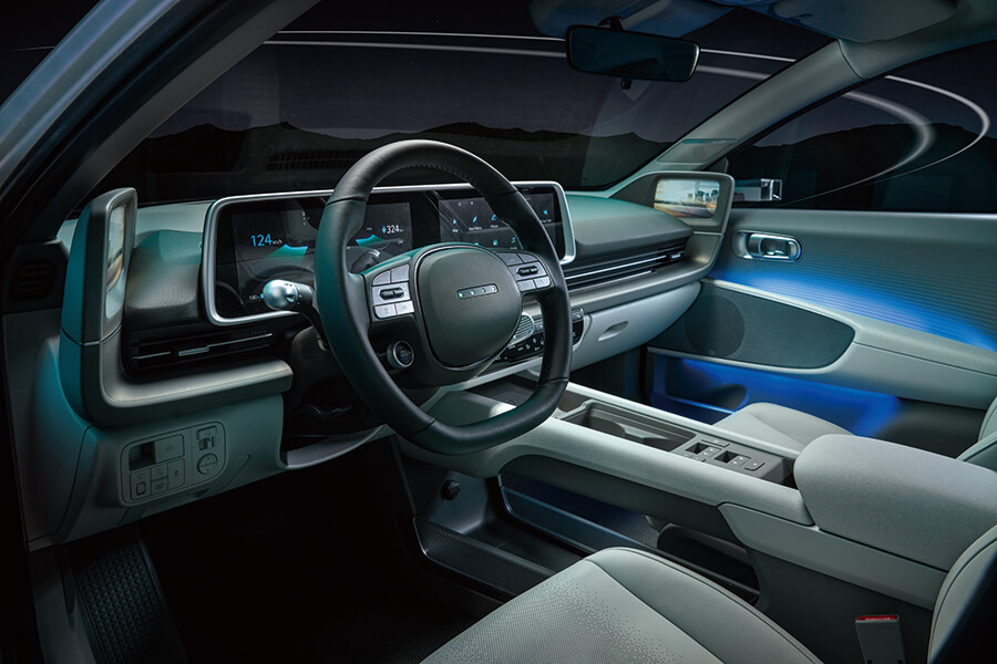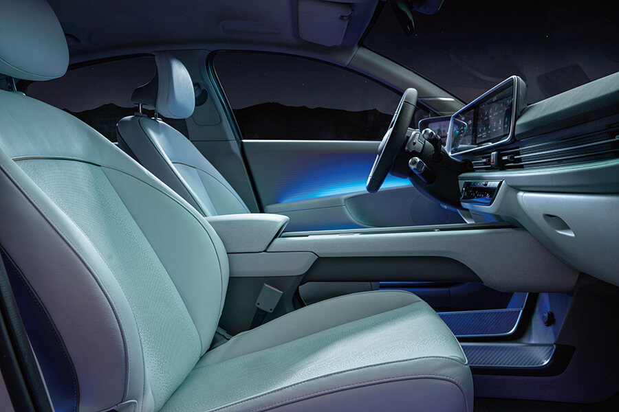 車廂按創作者的說法是一個mindful cocoon。Prophecy概念車不設方向盤,儀錶可以上下旋轉。Ioniq 6雖然較之傳統,按現今標準來說還是相當迷幻。方向盤沒有按例刻上廠徽,卻有四盞像素燈顯示充電狀態,使用聲控功能時還會一點一滅恍如對答。車門扶手槽在燈光照明下彷彿泛起陣陣輕波,低處置物槽採用透明設計以便你看清楚自己正在翻找的東西。此外還有可以選擇顏色的雙色照明(前後座皆有),以及與車速同步的燈光變色功能。選購數位車門鏡的話,儀錶板左右兩端會有一對狀如翼尖的後視螢幕支架。「我永遠不會忘記某次初期設計審查會議所發生的事。」Loasby說:「當時有一個傢伙用原子筆畫了一張草圖,不是在餐巾上畫吶,而是用了一些A4紙。為了造出機翼觀感,他畫了一隻鑲有螢幕的翼尖,那是我歷來見過最美妙的螢幕整合手法。」而且這對螢幕就算配合常規門邊鏡也可以如常使用。跟Ioniq 5的配置方式一樣,這個車廂也有兩個12.3吋觸控螢幕,平坦地板、極簡主義座椅設計和底部開放式中控台則從下方支撐著整個「居住空間」的發想。個別地方的某些用料雖然有點單薄,但也有許多地方使用了符合可持續發展理念的物料,譬如用亞麻籽油加工以減少用化合物處理的環保皮革,或者循環再造塑膠和魚網。