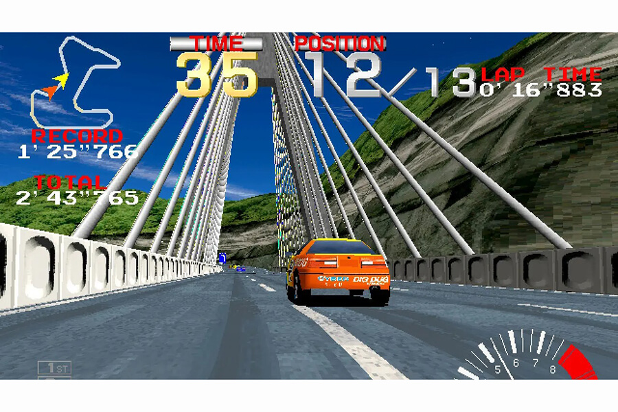 在此之前,遊戲玩家在通過彎道時有兩種選擇:您可以通過障礙物並獲得一具瘋狂冒煙的引擎,或者小心翼翼地踩剎車並在其他人超過您時大聲咒罵。雖然我們並不是說 Ridge Racer 發明了漂移,但這肯定是它第一次發揮作用——而且感覺——達到了應有的水平。它也是一個時代的產物,在這個時代,這個街機賽車遊戲帶我們經過沙灘、閃閃發光的大都市和不必要的巨大吊橋。