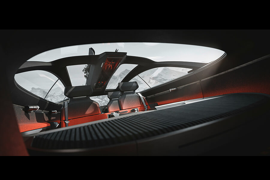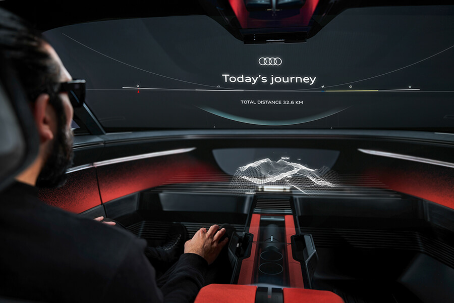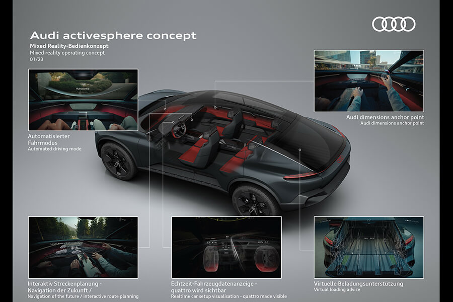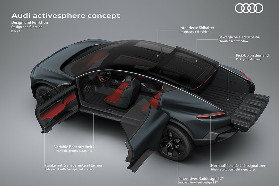 關於車輛後方的玻璃可以滑動至車頂上方、露出貨物空間並將Activesphere搖身一變成為皮卡車型。Audi表示這片貨床可以載運兩輛e-bike及一些運動器材,車頂則有一個整合式的滑雪支架。而此車的系統則結合了AR眼鏡,透過增強現實技術輔助乘員透過未來派的立體虛擬介面控制車輛,並由對開式車門將車室與外界隔絕。
