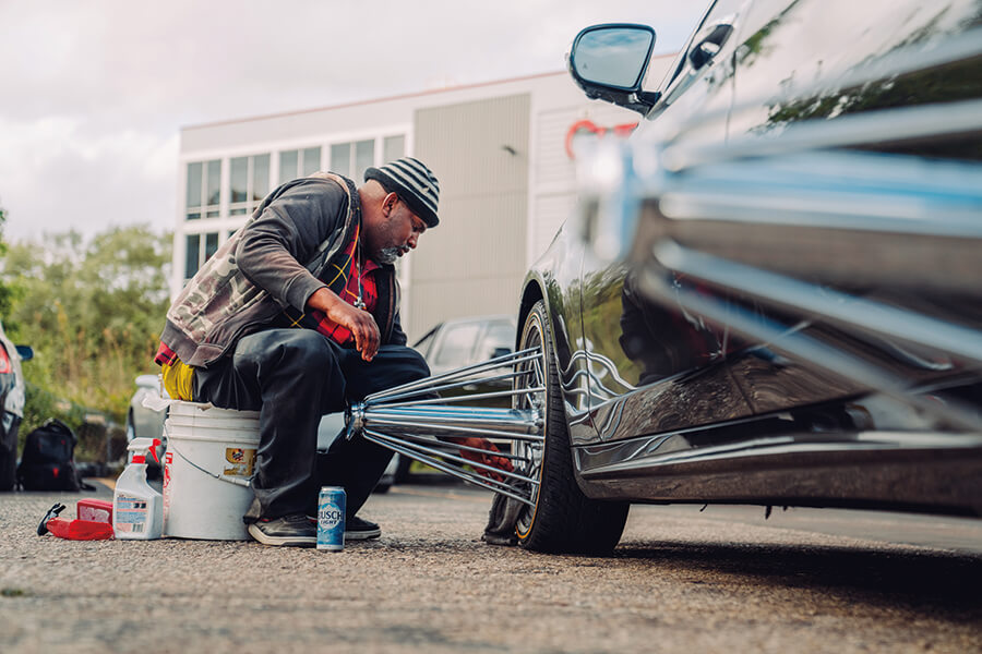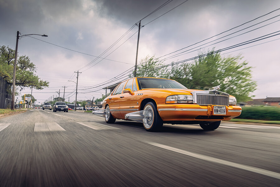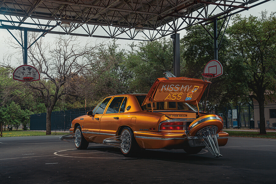 翌日一探休城東部時,我終於明白這番話果然有理。休斯頓比美國其他城市更像一個被高速公路籠罩的通勤都市,快速移動的交通會從高速公路分散到錯綜複雜的高架天橋網絡,道路之於休城就像維繫這個城市命脈的混凝土血管。這天我們約了East Up J Hawk在某個小區中心的籃球場碰面。這位著名slab車主兼改裝商最初涉獵的其實是賽車生意,後來在2007年轉型製作了自己的第一部slab,一部1990年標域LeSabre。有此變化,皆因他在成長期間受到OG slab車手的創意和心血薰陶,由是獲得啟發。他現時駕駛的橙糖色1996年別克Park Avenue,是坊間最正宗的slabs之一,正好作為說明一部slab憑甚麼配稱slab的完美教材。「你不能簡簡單單買一部slab。」J Hawk說:「必須從殘舊狀態開始修好整部車。」