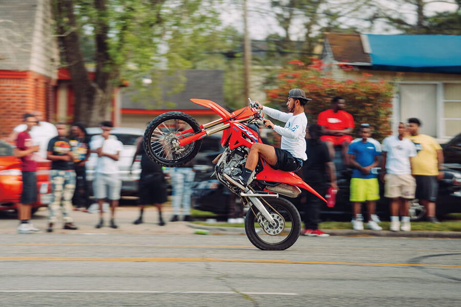 由於場面太擠擁,有數百人甚至「疏散」到公園隔鄰的六線高速公路上,所有人都鬼吼鬼叫興高彩烈把我們正在目睹的職安健惡夢發送到串流平台上,還不時嘆兩口sizzurp(請參看第XX頁的俚語小字典)或大似胡蘿蔔的加料香煙,亦有人騎著摩托車玩翹孤輪磨尾牌。這邊剛看見老手用金光燦爛的三輪摩托車在燈位前擦地生煙,另一邊便出現一班屁孩騎著四輪越野摩托車大玩甩尾搞到沙塵滾滾。不過無論有多少個車輪,這些摩托車都只是重頭戲的配角,主角始終是場上汽車。