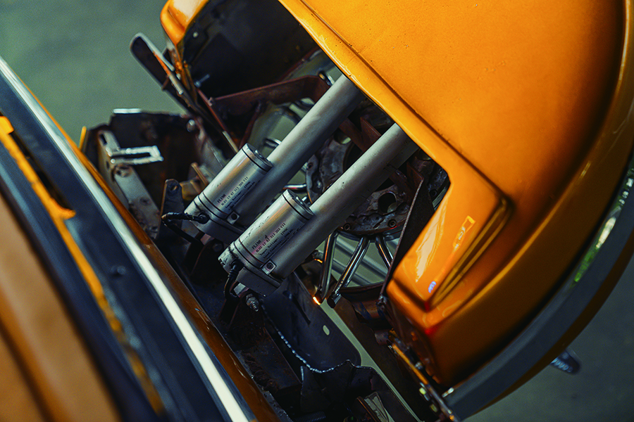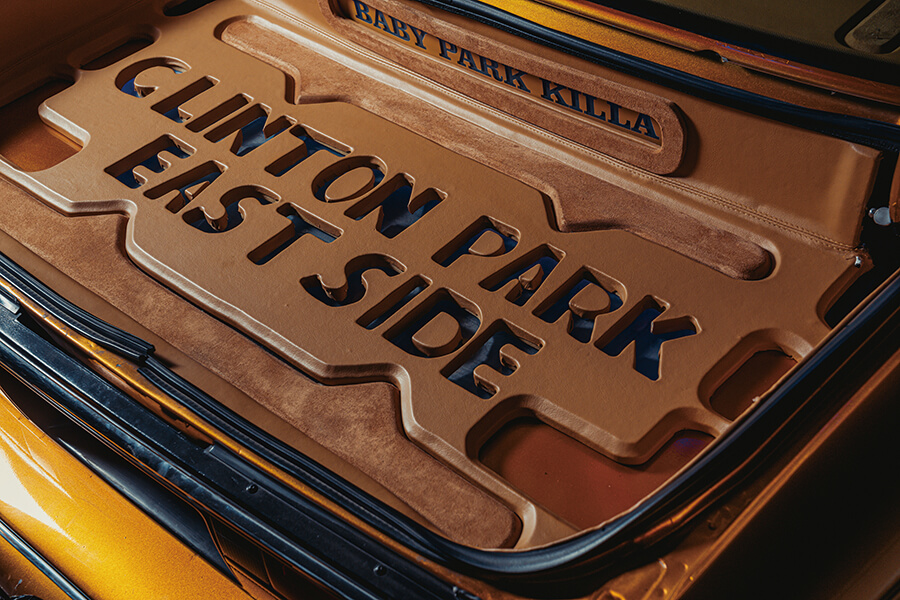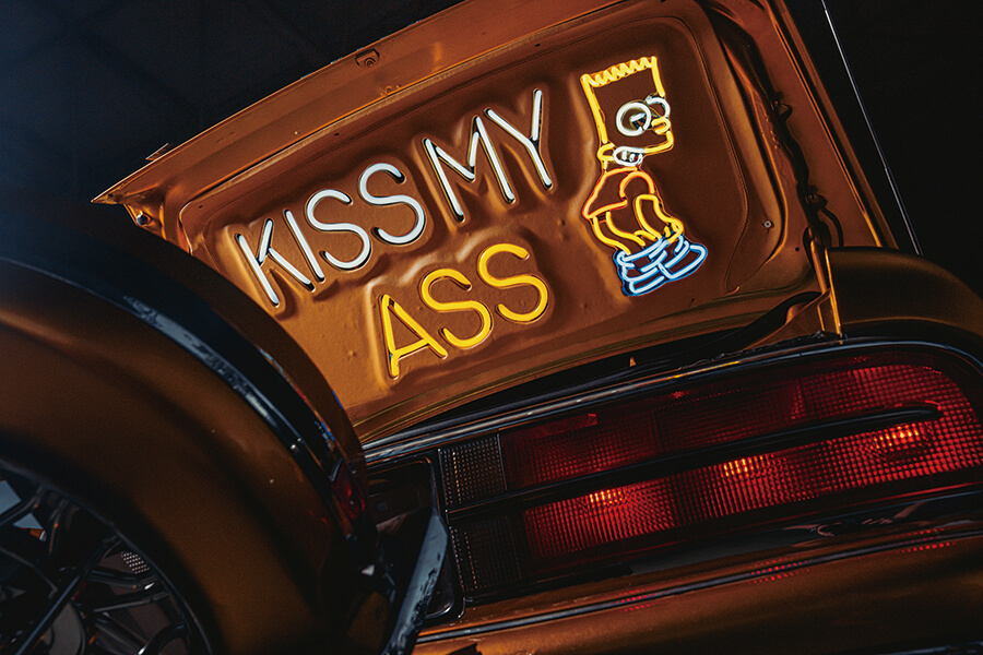 保桿套件的作用是把第五個車輪固定於車尾,那條裝飾性的鍍鉻「腰帶」旨在營造出牢牢箍緊尾廂的觀感。為了pop trunk(彈開尾廂門是也),尾廂設有致動器操控的機關從內側推開尾蓋展示內裏行頭。所謂尾廂行頭,就是用霓虹燈傳達你想傳達的任何信息,內容可以是紀念某人某物、一段摘錄,或者像J Hawk那樣,用四組霓虹燈勾畫露出八月十五的Bart Simpson和他的金句「Kiss my ass」。為甚麼?「因為我就是喜歡阿森一族」。他亦喜歡摔角,所以收藏了好些WWE冠軍腰帶。