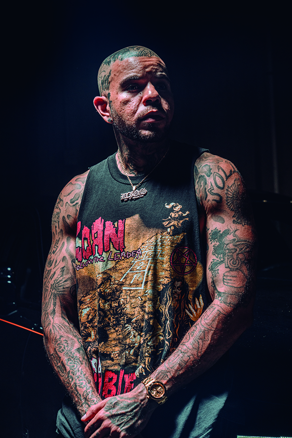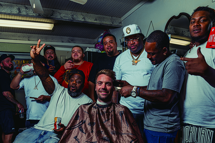 當晚稍後時分,休斯頓潮濕酷熱的天氣簡直熱似老天打算用我們的面龐直接烤熟一兩塊墨西哥捲餅,但腋下濕了一大片的我們終於迎來迄今為止收穫最豐富的一場訪問。在幽暗停車場等待我們的,正是皮膚泛著點點汗光全身珠光寶氣的說唱歌手Slim Thug,身旁站著他的同儕兼我們此行最初的嚮導阿Le$。