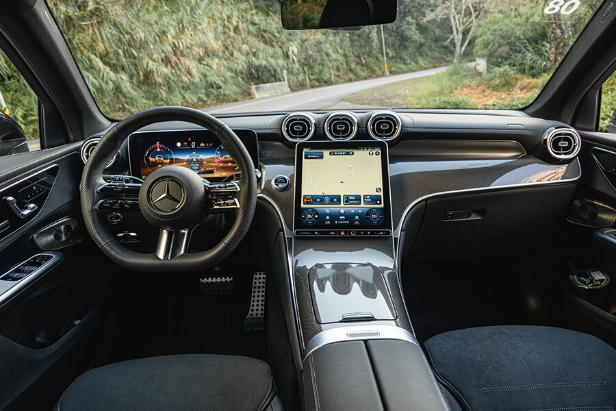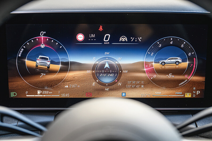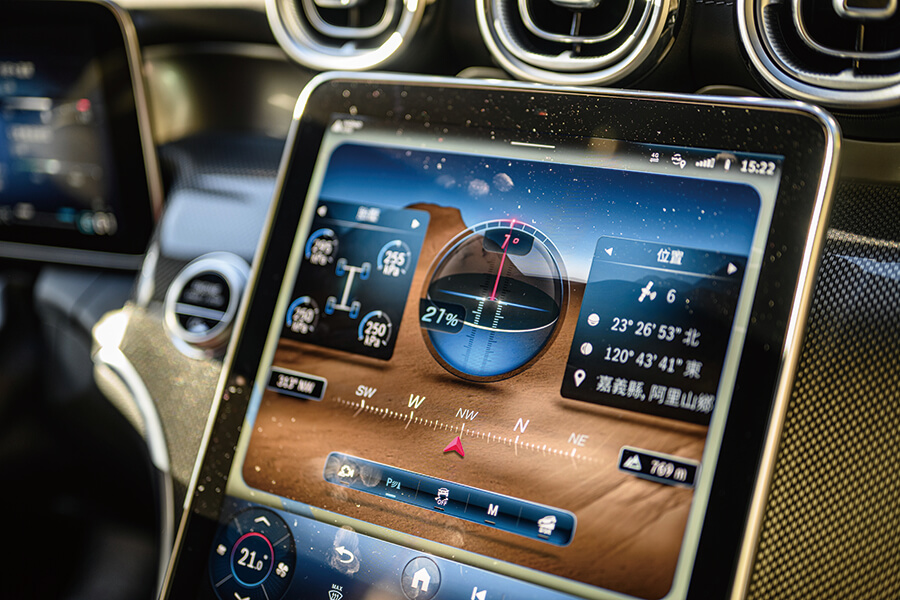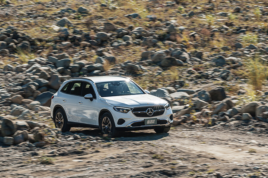 至於那套MBUX介面,整體來說已經十分熟悉,針對GLC則是追加了一套越野資訊介面,在電子顯示極度方便的現在,很輕鬆地可以在儀表或中控螢幕上來看到各種車輛訊息,同時包含正式販售車輛都會附上的底盤透視功能,結合前視攝影機分別負責8公里以下與8-20公里車速的顯影畫面,這在我們前往廠方特別安排的荒野路段行經一些上下陡坡落差又帶轉彎的路線時,確實派上不少用場,或許會成為另類的露營區神器也說不定。