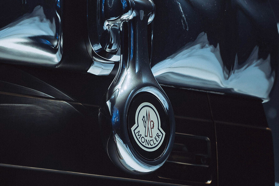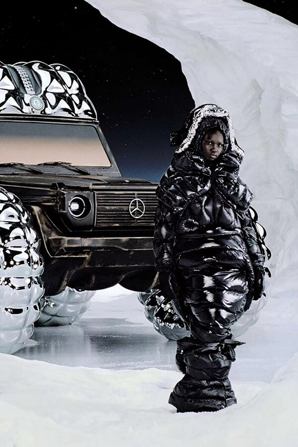 “這件藝術品融合了截然不同的形式和表面,”Benz 設計主管 Gorden Wagener 說,“它結合了航太設備般閃亮的材料、同時具有仿舊的古銅色外觀,G Car剛硬的幾何形狀融合了有機型態的 Moncler 羽絨服。”