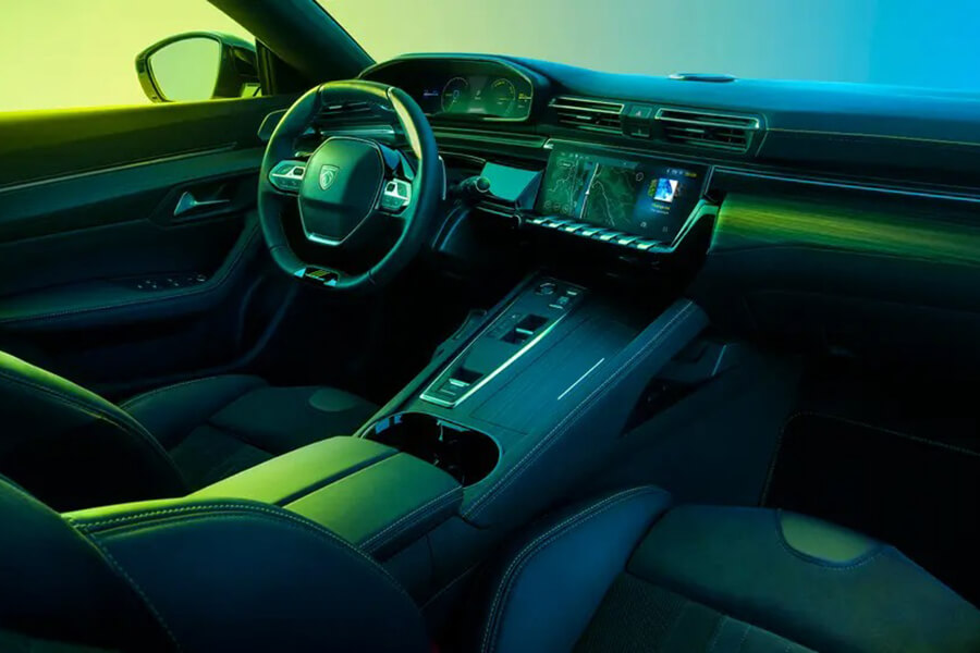 至於內部可以發現排檔桿已由線傳撥桿取代:像是先前各為已在208 / 2008上看過的情況。同時兩輻式方向盤上也改為Peugeot的新式盾形徽標。i-Cockpit當中的10吋螢幕可以藉由無線更新,同時12吋的數位儀表可顯示導航、媒體以及駕駛輔助等顯示模式、並改進了語音識別軟體。