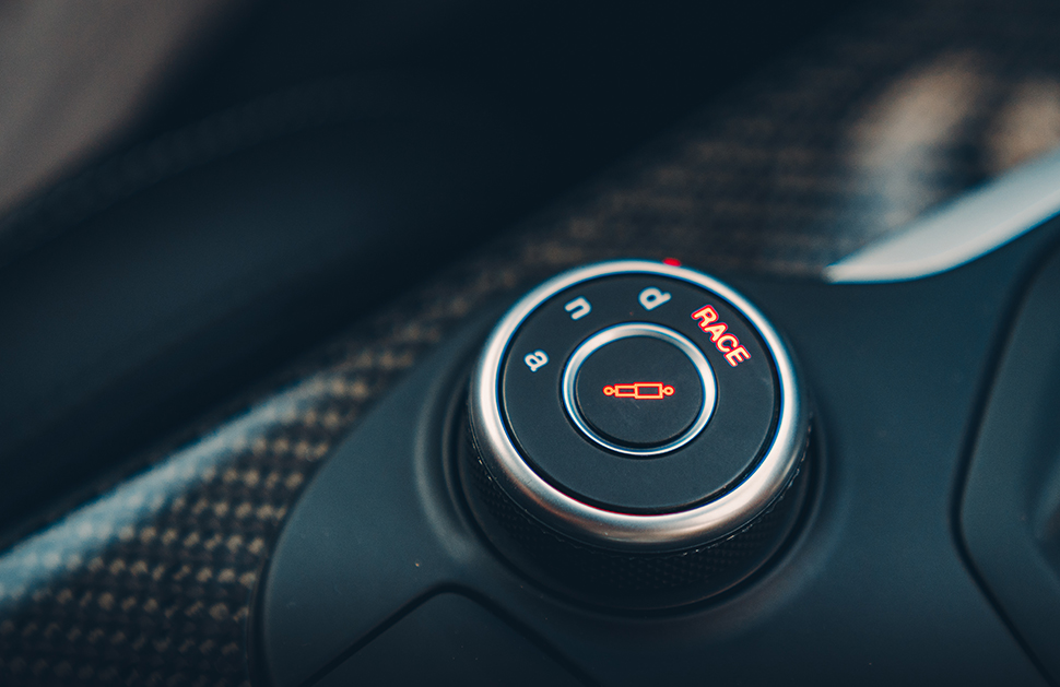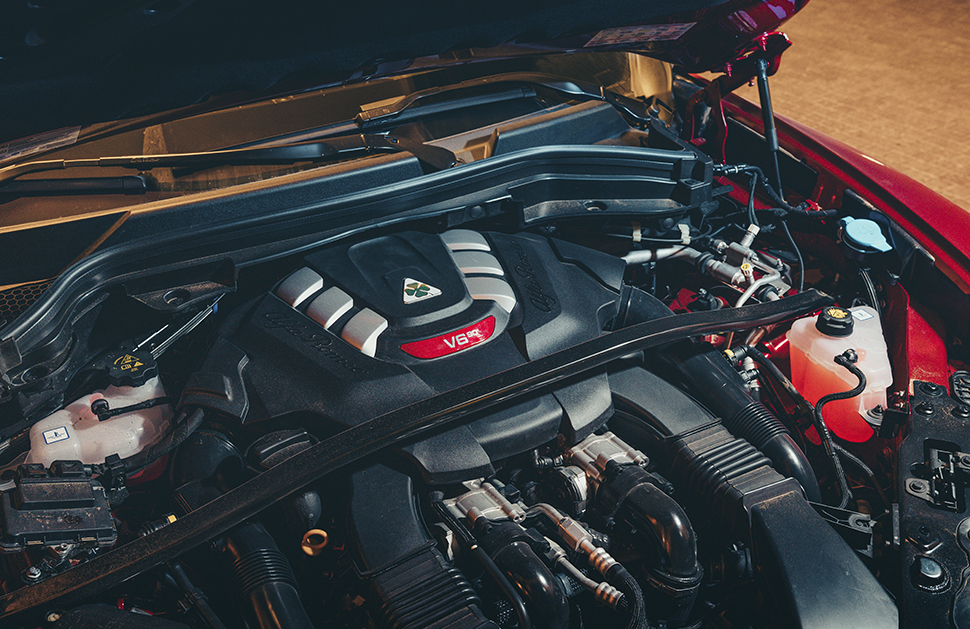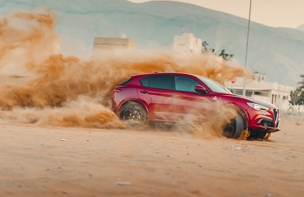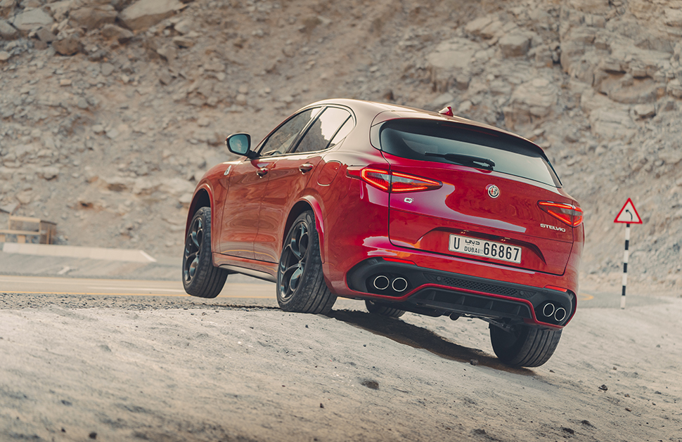 這款愛快跟大家的預期也大有出入。你用少於3.4萬英鎊就可以買到一部精打細算,停在Mothercare和瑪莎百貨公司外猶能吸引注目禮的2.2公升渦輪增壓柴油Stelvio。不過精神奕奕載著我們突破拉斯海瑪(Ras al-Khaimah)精肉起司商場的Stelvio並非那麼溫文儒雅的版本,那些綠色(verde)四(quadri)葉草(foglio)為記的白色徽章便透露了這部漆上Competizione Red塗料的Stelvio其實是快刀手。就算對徽章不以為意,從引擎蓋上一對散熱槽、四出尾管和輪拱也可以看出端倪。