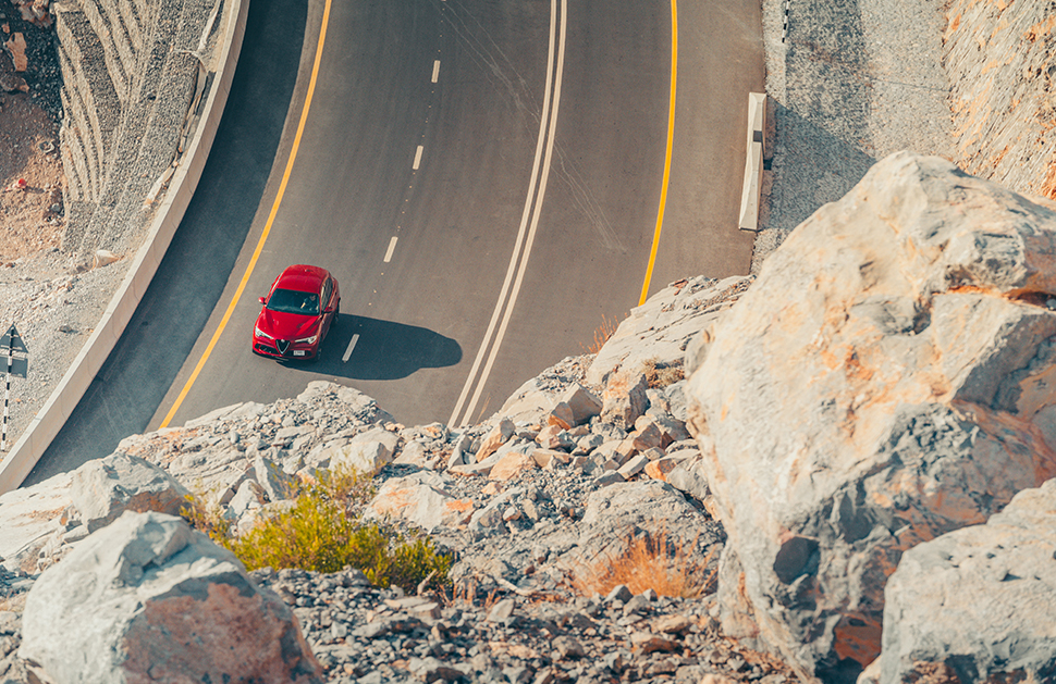 我們有八個小時跟愛快羅密歐Stelvio Quadrifoglio快活。攝影師Mark已將攝影器材塞滿尾廂和後座,加上兩個大男人加起來的體重,接下來一個小時車程將會帶領我們沿著世上最精彩的死路登上阿拉伯聯合大公國第一峰——哈伊斯山(Jebel Jais)。