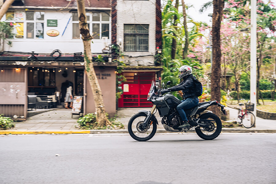 為了符合Ténéré這可追溯回一段達卡拉力風光史之名,TG特別規劃了一段由都市逐漸轉換至野外的試車路線。在台北都會騎乘T7其實亦好處多多,除了騎姿正、視野廣,可以輕易看穿前方3-5台車的位置及動態,無形中消弭許多視野死角,騎乘時由居高臨下的寬廣視線可以帶來相當大的安全感,不過就是走走停停的環境需要頻繁地下腳依舊有些惱人,當重複次數一多自然還是會比起駕馭一般街車要來得疲累。不過在這個相對頻繁使用把手總成的環境,也能發現Ténéré 700的按鍵總成看似簡單粗糙,其實操作時的就手性意外地好,不僅距離手掌較遠的雙黃燈有做較為突出的設計,儀表上的資訊也可透過位在右側總成上、較為少見的單向撥桿向內推送以進行流轉切換。