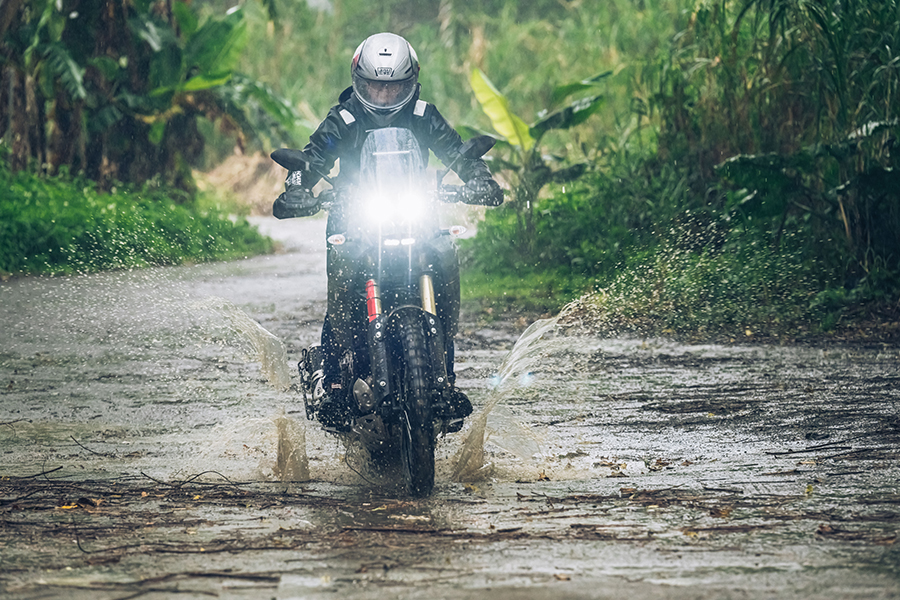 前往距離城市不遠的水邊秘境需要穿過一小段充滿坑洞的土路,此時竟然天降大雨,即便身著具防潑水功能的防摔衣也於事無補。那好吧!哪有拉力車手遇到下雨就罷工的。雨水慢慢匯聚成流、填滿坑洞的過程也讓路況更加無法預測,而泥土也漸漸變為泥漿。不過這一點改變對T7來說顯然不構成任何威脅,只要雙腳一站、帶著適當的速度直直前進,路上的障礙顯然化為使旅途增添風味的辛香料,並且讓你馬上想要開始嘗試些更重的口味…。舉例來說,直直向倒落路邊的小樹枝幹衝去,只見”咕咚”一聲,除了車身微微一顛以外,立在車上簡直安穩得過分。