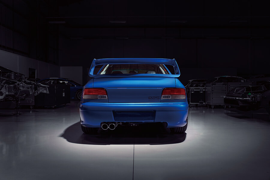 Prodrive留下了22B本體的車殻、車門和玻璃循環再用,其他鈑件全部用碳纖維重新製作(包括那隻招牌尾翼和毫無用處但非常可愛的整流車門鏡)。車身配件由麥拉倫F1和捷豹XKR-15計劃的設計天才Peter Steven監製(22B的設計正是出自同一人手筆)。拜輕盈鈑件和鋰離子電池等現代技術所賜,P25的重量只有1,208kg,比豐田GR86還要輕盈,減重幅度幾乎相當於我的體重,而且僅靠兩個車輪驅動,動力卻幾乎翻了一番。