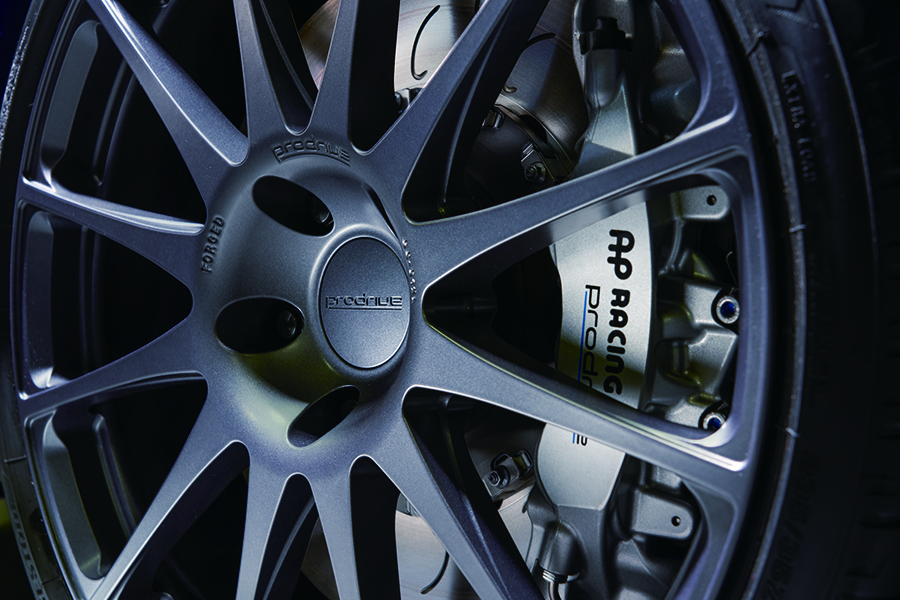 在細小車身映照下,輪胎套著的19吋輪圈在我看來略嫌太大,不過為了容納前方380mm的大型煞車碟,這個尺寸實屬必需。輪圈之所以塗上灰色,因為Prodrive希望他們的作品與坊間的藍身金腳掃把佬改裝大軍劃清界線。