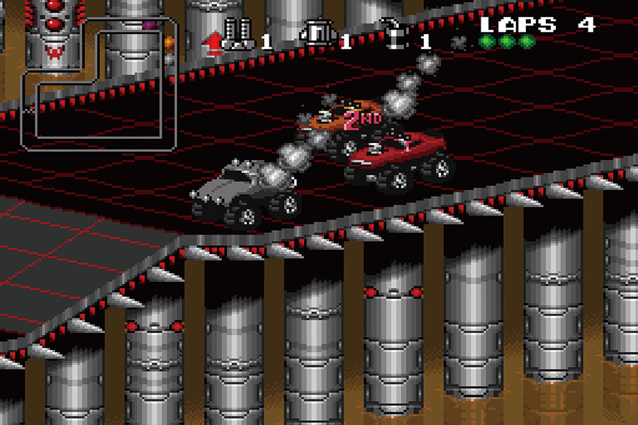 這不過是遊戲曲目收錄的其一首歌,其他配樂還包括Deep Purple、Steppenwolf和Black Sabbath名曲,至以可以確保Rock n’ Roll Racing永遠不會有被人告上公平貿易局的風險,幸好遊戲本身的比賽過程亦恰如其分。大家不妨想像那是一個用重火力高蹺科幻沙灘車解決宇宙爭端的未來,一個類似Car Wars多於Star Wars的未來。