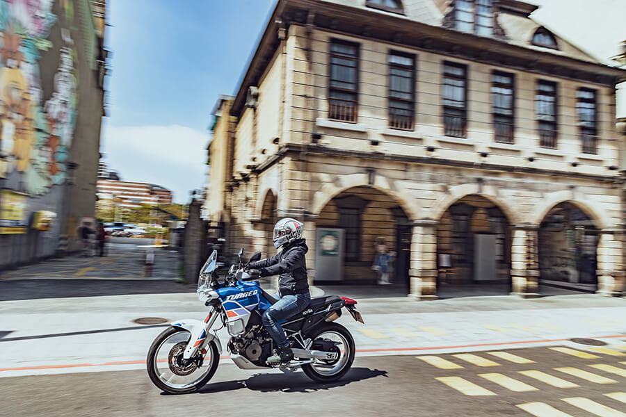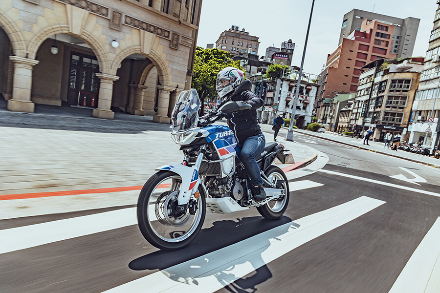 行駛在工作日上午繁忙的台北街頭,Tuareg 660騎起來並未帶來苦行僧般的"深刻印象"。出乎意料地,屁股下的那片線條比直男還直的坐墊不僅寬度相對較寬、質地也顯得稍為柔韌,有別於尋常越野車、ADV車款的硬梆梆。因此雖然舒適度仍稍不若一般街車,不過已經是相當適合長途騎乘的呈現。雙手握持寬大的車把、左右打的輕盈度顯然就是近年來中量級ADV出現後所帶來的親切手感,完全想像不到在240mm懸吊行程外連接的,竟是21吋的大腳前輪。可想而知在街區間逡巡時的迴旋其實相當迅敏靈活,只要重心一帶、油門一給,後輪就能亦步亦趨地跟上腳步,1525mm的軸距如屬無物。至於走走停停的車況?身為並列雙缸中排氣量車款的纖細身軀搭上860mm座高,身高175cm的筆者腳一伸就能輕鬆著地,免煩惱啦。