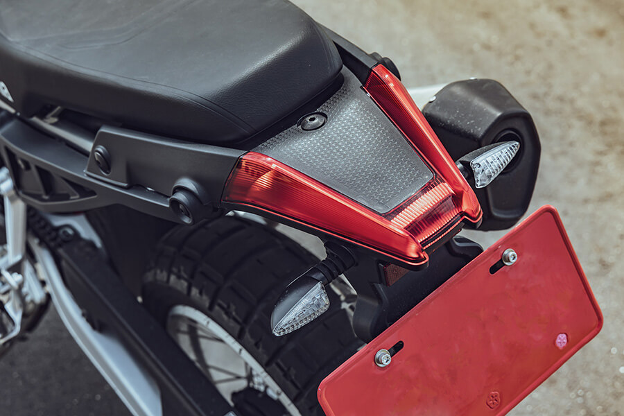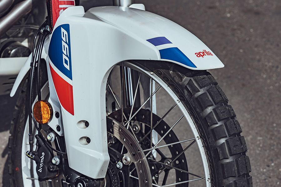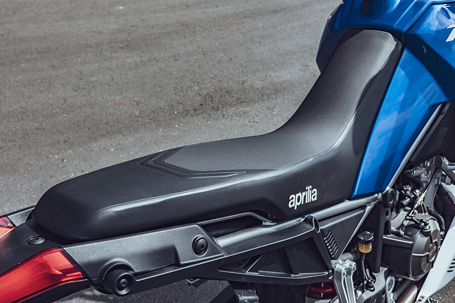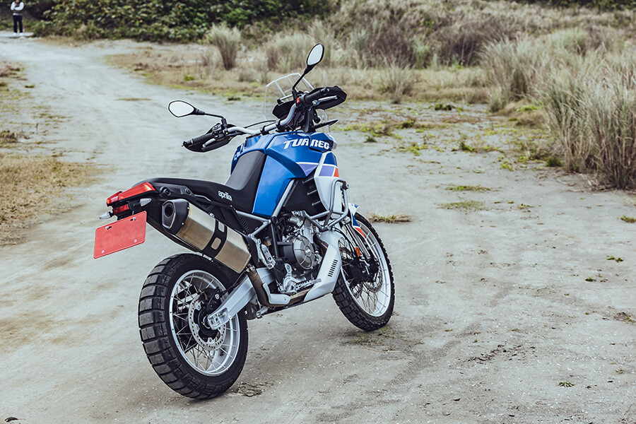 引擎下方就是Adv車型必備的護板,阻隔超過240mm離地高之外的惡劣地形,與引擎及排氣管親密接觸。而排氣系統在通過車架樞軸過後往上走,最後在車尾稍低處鎖付尾段以應對涉水情況。而窄長的坐墊涵蓋了油箱下半部,在最低處轉折後一路平直延伸至最後。雖說如此,在拍攝期間載著攝影阿加時,這張坐墊的在減速狀態時並不會造成後座人員向前滑動,想騎這台車載妹子打歪腦筋的可要失望了。至於尾燈造型實在是難以用言詞形容的特殊,請看圖~正當我還在大驚小怪時,一旁的Edward表示這設計他似曾相識。細看一想後發現也對,這不就與充滿復古未來風格的Y2K Style不謀而合嗎?其實往後退兩步看,整台車塊狀感十足的輪廓其實頗有舊時代車款的風情。事實上你以為在模仿鋼彈、或是效法爆走兄弟的藍白紅塗裝,其實Aprilia是在向自家產品歷史中同樣充滿沙漠風情的Tuareg 600致意。