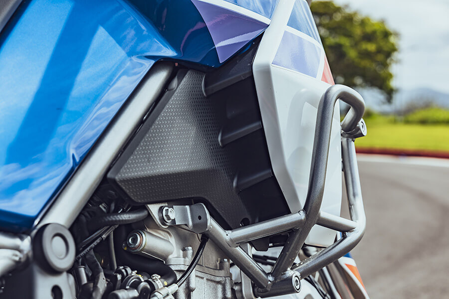 多功能車?Adventure?在約十年前向別人提起這類車型時,往往會被問到”是那種比較沒那麼帥的車嗎?”至於今天這部Tuareg帥嗎?或許見仁見智,但此車上路後紛紛引起路旁歐吉桑不住地看過來、小童開心地朝我的方向指指點點等諸多騷動可不會說謊。接近倒梯形的LED頭燈與內部的雙V型日行燈真可形貌特殊,兩端的假進氣口一路往後延伸,為窄高的車身增添氣勢。車殼與油箱下方掩蓋不住來自RS660的並列雙缸引擎,帳面上的馬力雖然縮減了20hp而僅有80匹馬力,不過最大扭力倒是不減反增,來到7.13kgm,峰值也提前在6500rpm便湧現。