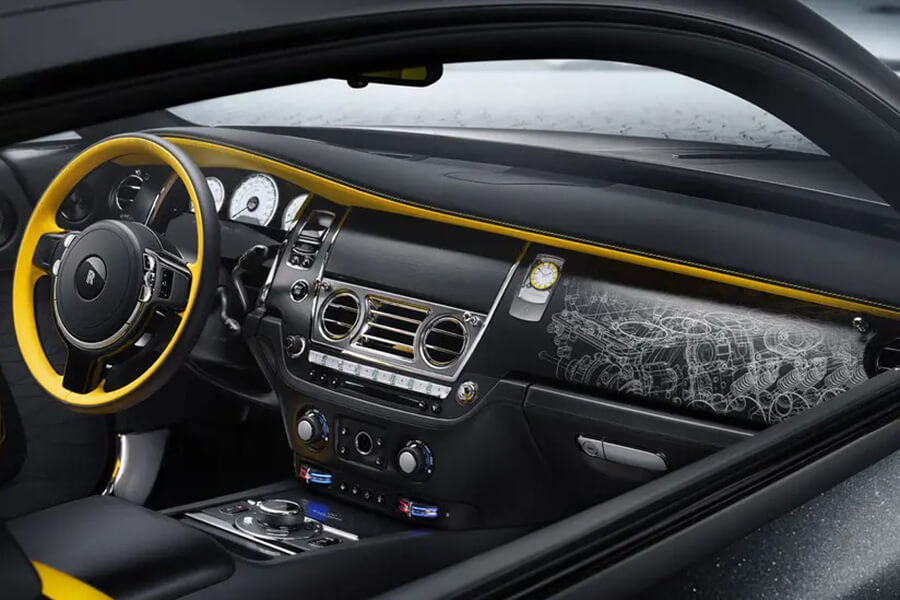 在這部Black Badge Wraith Black Arrow上你可以看到表面的漸層車漆,由慶典銀逐漸過渡為鑽石黑的表面,可是足足花費18個月調配而成。至於內部由創紀錄的2,117 盞光纖燈、以及門板上透過320面開孔黑木鑲板構成的複雜設計。回到車身表面所耗費的功夫上,為了使這些珍稀寶貝能顯現出玻璃般光可鑑人的表面,一些可憐…更正,一些非常敬業的靈魂們必須將他們進行超過12小時的打模工作―想必他們會很高興此車僅限量12部。