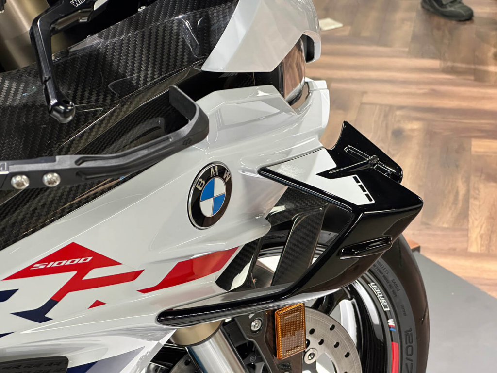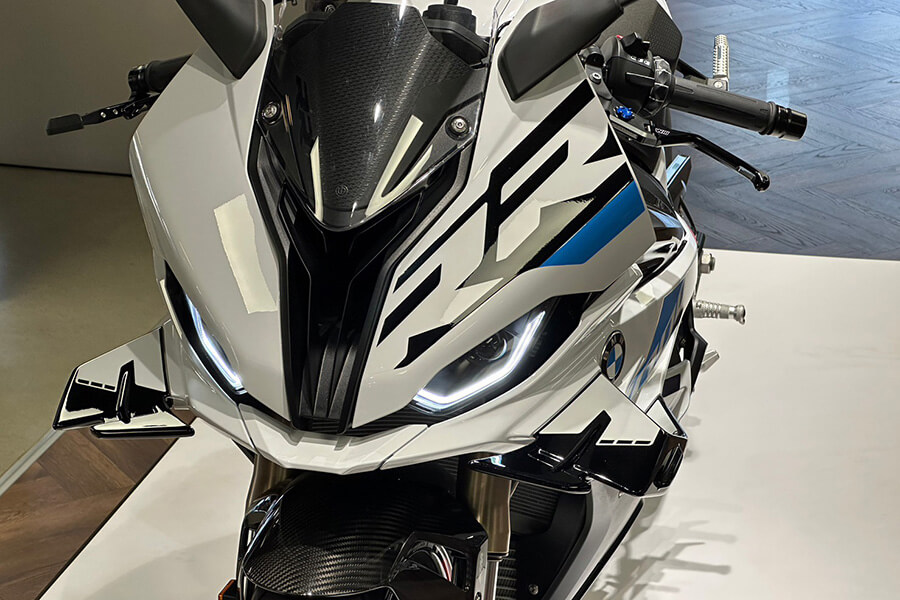 去年秋天發布小改款的S1000RR很快地在新一年春暖花開之際正式於台灣上市。在外觀上各位可以很直接地發現車頭多了一副定風翼組件,造型上對空力的著墨甚至對比小改前的M1000RR可說是有過之無不及,不僅在翼面最前端做出多角度迎風設計,在車體表面翼有突出的小鰓設計。這組橫跨車頭的空力套件能在加速時產生空氣下壓力,藉此對前輪施加負載,因而可以抑制因為猛爆動力而躍躍欲試的車頭,並且增加轉向時的穩定性。同時新款S1000RR也換上了更高角度的風鏡、下三角台也經過重新設計,以提升空力性能。看來從motoGP到市售車,各廠對於空氣力學的琢磨可是越來越深。