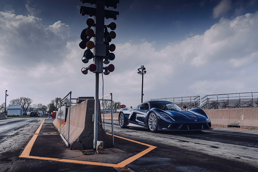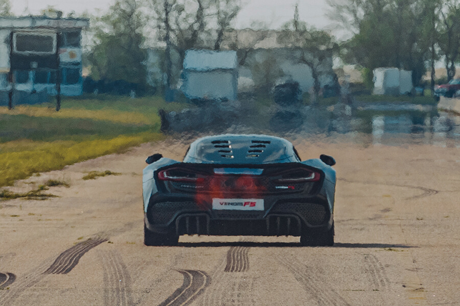 無論是單板大跳台滑雪、鬥牛、花式飛行抑或駕駛一部姑且偽裝成街車的1,817hp直線加速賽車,但凡追求極至境界,總會無可避免出現膽大妄為勇闖未知領域的「兄弟看這啦」時刻。那可能是你的初次單人360度大空翻,初次踏進有盛怒母牛徘徊的獸圈,或者第一次全速衝向天與地之間。你好清楚自己應該怎樣做,卻無法肯定會發生甚麼事。此刻的我便處於這種患得患失的狀態,一邊盤算著下一步該如何是好。為求體驗最純粹的初次邂逅,我迄今從未開過F5,所以大腦正在盡最大努力麻痺我的神經,畢竟坊間有不少故事講述動力較F5弱的Hennessey作品曾經在這條直線加速賽道做出好些意想不到的事情,譬如在四檔225km/h之下失驚無神車輪打滑,所以在下才會好生焦慮。