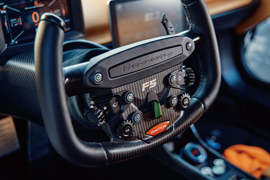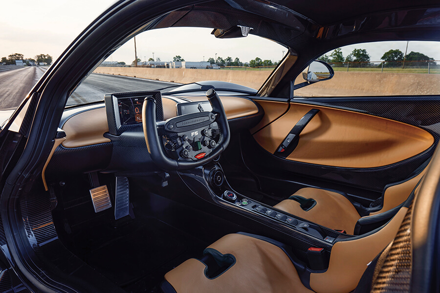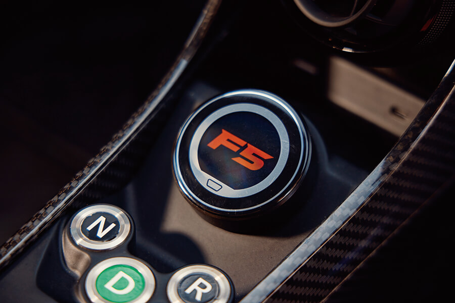 不用你講我也知道啦。登上F5的感覺就像請纓把自己綁在火箭上,興奮得來不無懼意。這副6.6公升雙渦輪增壓V8引擎名叫Fury(我是說真的),顧名思義就是泰森那樣的重拳手,最大馬力竟有1,817hp。由於底盤、外殻等等皆以碳纖維製造,F5的乾重只有1,360kg,僅以30kg高於法拉利F8 Tributo,馬力卻相對多了1,000hp。這股馬力在8,000rpm達到巔峰,十分接近8,500rpm轉速極限,164.9最大扭力則在5,000rpm湧現。這款引擎以通用汽車的LS推桿式V8作為基礎,但已經用直線加速賽規格的內部機件和大似垃圾桶的渦輪增壓器徹底重建,變速箱用上七速單離合半自動貨色。性能表現據稱勁到離譜,0-100km/h只需2.6秒,0-200km/h是4.7秒,0-400km/h不外乎15.5秒,差不多比又大又可愛的Bugatti Chiron快了一倍。