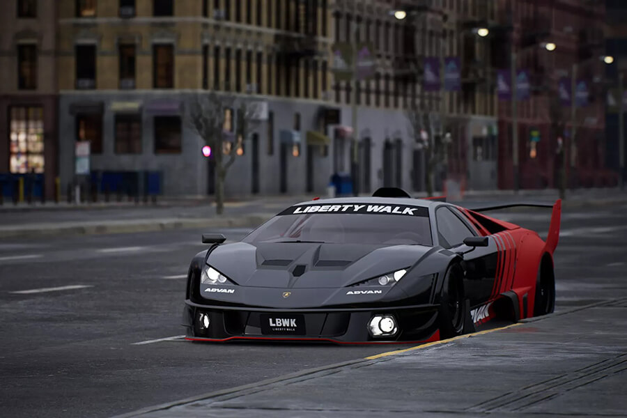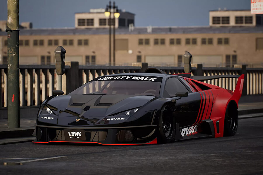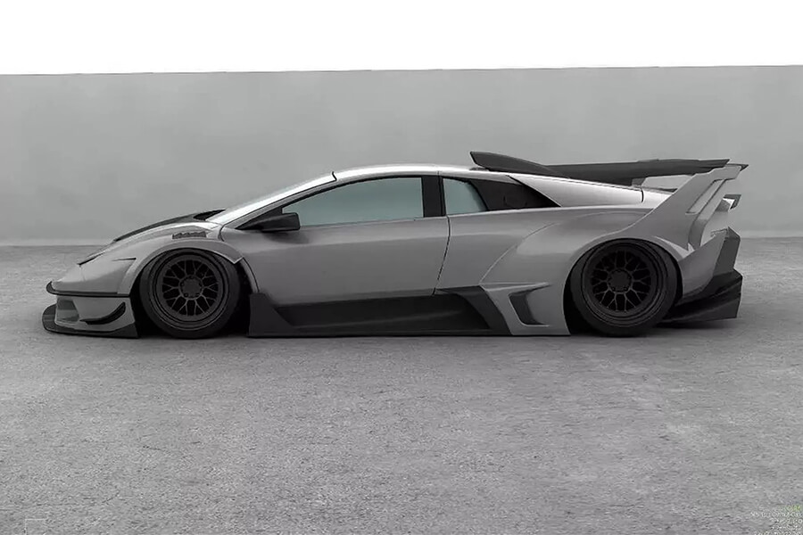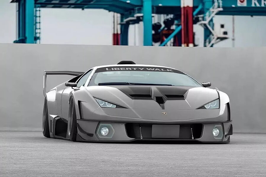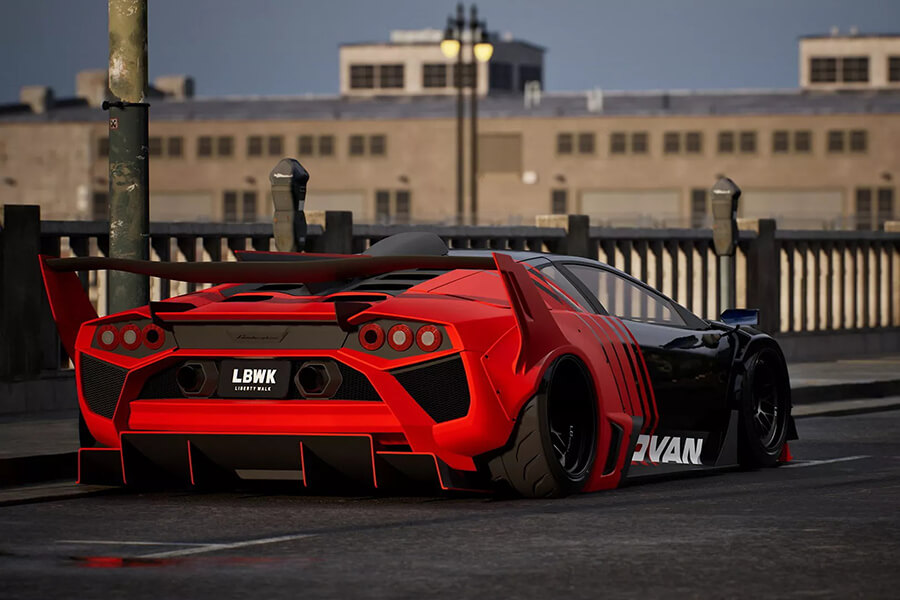 在車身上依然保留了Murcielago可伸縮的”主動式進氣口”,不過Liberty Walk照例在下方安裝了以螺栓固定的超誇張寬體,後拱前方的進氣口也順理成章地擴大、同時一併修改造型。在超大型尾翼下方的車尾也經過重新設計,輪廓顯然參考了Countach LPI 800-4,搭配內圈的三圓尾燈組,最下方則是賽車味十足的擴散器。