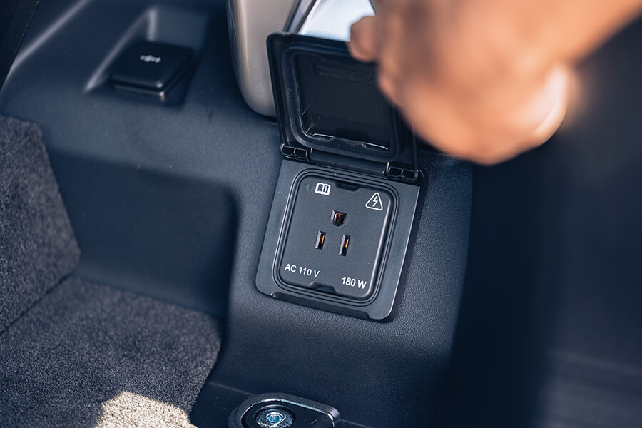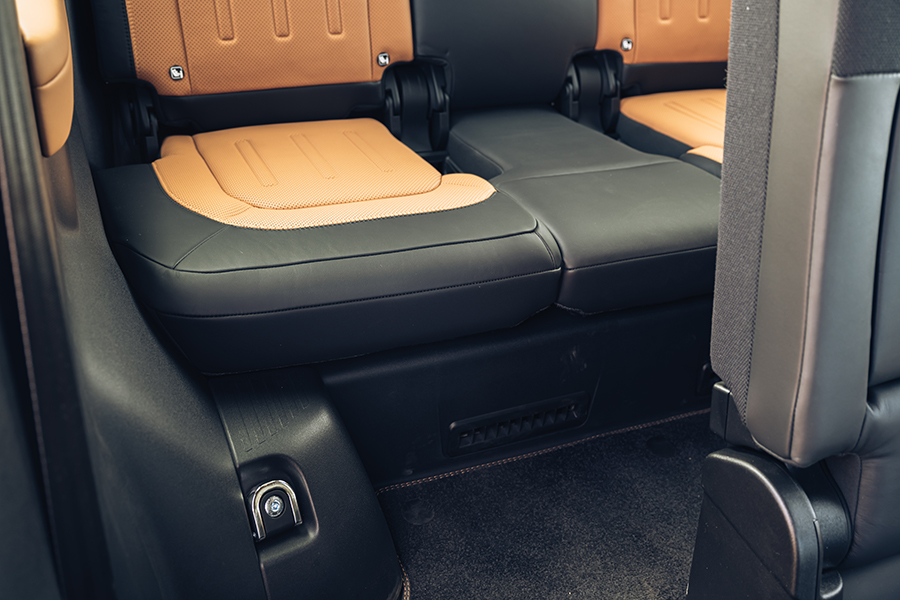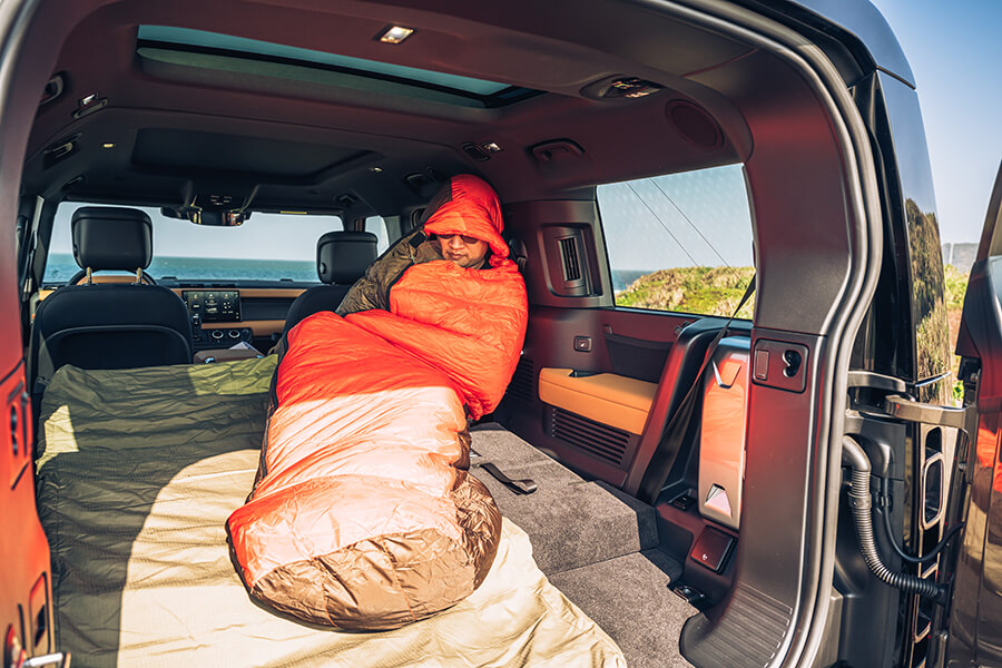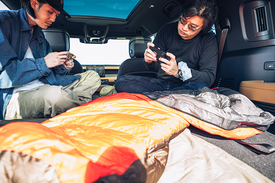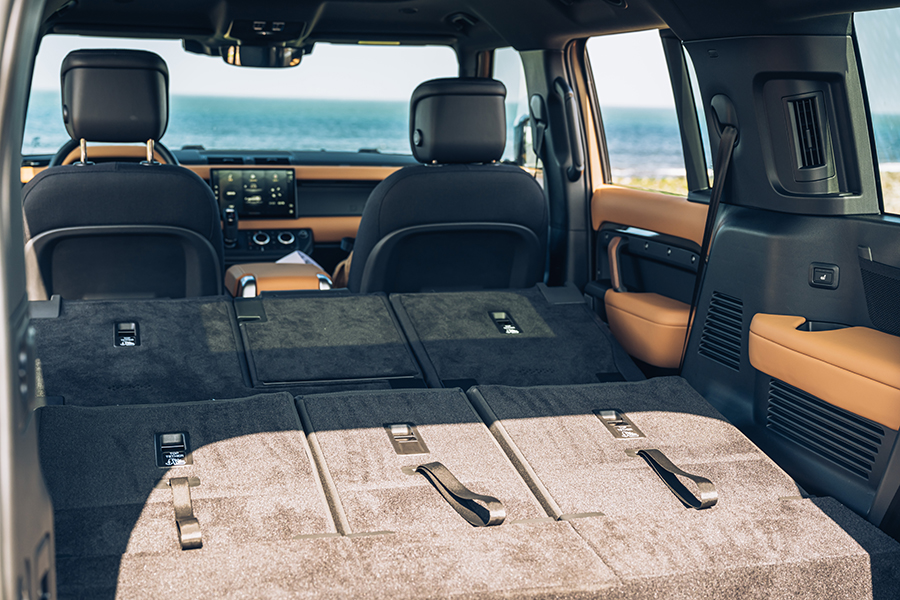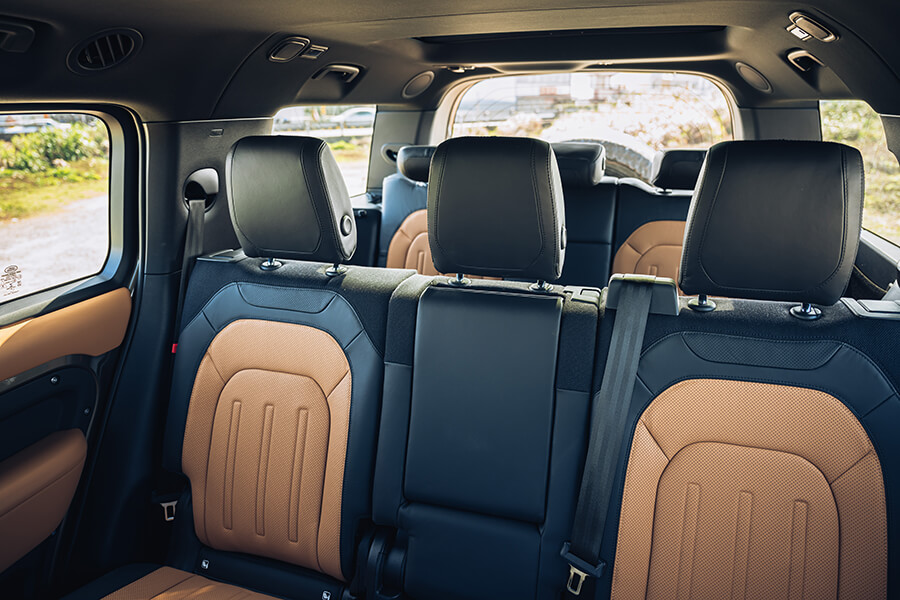 空間數據這方面很有優勢,但實際體感呈現上的空間我倒是覺得有點不盡理想。Defender 130的二、三排打平後就像是海浪一樣波滔起伏,平整度可說為零,雖說我們也了解許多露營愛好者會有充氣床墊來提升平整度,但這天位在車尾的110V、180W供電插座似乎無法滿足打氣機的電力需求,不能讓我一圓Jackal拍照我睡覺的小小夢想實為可惜;另外,第三排座位正好座落在後輪拱之上,受惠於車尾空間夠大,我入座後還覺得身體周遭挺開闊,但腳部空間就很明顯會被輪拱前段擠壓要往中間擺放,容易出現歪坐一側的姿態,這方面的表現,確實沒有自家Discovery兄弟來得進退自如,全打平後的車艙高度其實也沒有發揮出大車體的優勢,很明顯,疊加在上的第三排是個元兇。