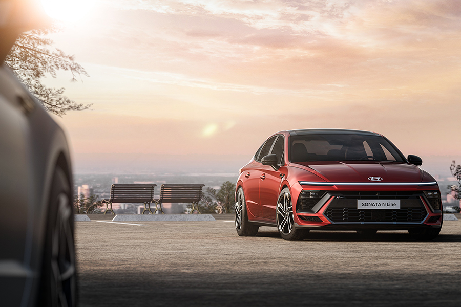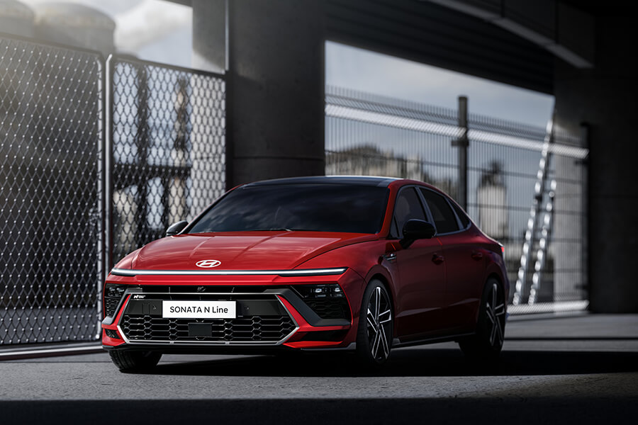 在Sensuous Sportiness設計理念下,新一代Sonata換上了橫亙車頭的水平LED日行燈條,主司照明的頭燈組則融入兩側進氣口上緣,同時格柵設計線條也更犀利、更強烈,同時引擎蓋線條亦經過重新安排。在車尾,同樣橫跨車輛全寬的H型尾燈、搭配斜背與後廂蓋上的鴨尾造型,與雙邊出口排氣管及19吋輪圈塑造跑格樣貌,同時有四出尾管配置的N line藏在圖集當中。